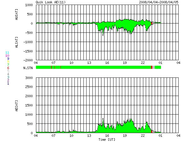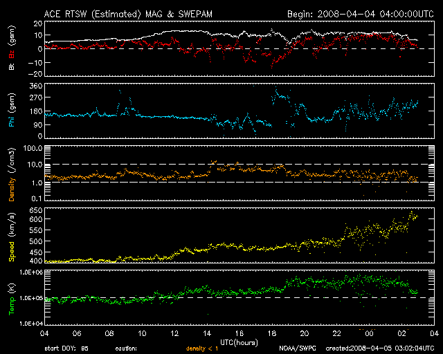 2008/ 4/ 5 12:03 更新 高速太陽風が始まりました。速度は600km/秒を超えつつあり、オーロラ活動も始まっています。 担当 篠原 高速太陽風がやってきました。 昨日のニュースの後、太陽風の磁場強度はゆっくりと強まって、 4日20時(世界時4日11時)頃に10nTに達しました。 そのころから、速度もゆっくりと上昇を始め、 今朝、5日7時(世界時4日22時)頃に500km/秒を超え、高速風が始まりました。 現在は600km/秒に達しつつあります。 高速風到来のタイミングは、前周期とあまり変わらなかった様です。 この後も速度は上がり続け、明日には700km/秒くらいになるのではないでしょうか。 高速風がやって来て、磁気圏のオーロラ活動も強まっています。 AE指数では、500〜700nTくらいの中規模の活動が見られています。 ただ、太陽風磁場の南北成分(赤線)を見ると、 概ね北向き(プラス方向)に推移しており、速度と磁場強度が強まっている割には、 地球にはそれほど大きな影響を及ぼしていません。 この後も南北成分が北寄りで進んだ場合は、オーロラは現在程度の活動となるでしょう。 一方、どこかで南寄りに傾向が切り替わると、オーロラ活動は一段激しくなります。 SOHOの写真が更新されていないので、STEREO BehindのEUVI 195写真を掲載します。 コロナホールが太陽の南半球に大きく広がっています。 この衛星から見る太陽は、地球で見るよりも1日半ほど進んでいます。 その分差し引いて(コロナホールなどを東側にずらして)見る必要があるので、 注意して下さい。 今、まさに、地球に向かって高速の太陽風がどんどん吹き出しているところです。 高速風の中心部はこれからやってきます。 引き続き、太陽風、磁気圏の変化に注意して下さい。 放射線帯の高エネルギー電子は、高速風の到来によって大きく数を減らしています。 しかし、明日以降は、増加に転じる可能性がありますので、 今後の変化に注目して下さい。 太陽では、988黒点群が太陽の向こう側に回ってしまいました。 このため、太陽は無黒点になっています。 STEREOの写真では次の黒点が出てくる見込みもなく、しばらく寂しい太陽になりそうです。 STEREO衛星極紫外線望遠鏡EUVI195による太陽コロナ。5日9時(世界時5日0時) (c) NASA ![]() ACEが観測した太陽風の磁場(1番上の枠、白線は全体の強度、赤線は南北成分) および、太陽風の密度(3番目の橙線)、速度(4番目の黄線) (c) NOAA/SWPC ![]() リアルタイムAE指数 下段のAEグラフの値が高くなると、オーロラ活動が活発化しています。 (c) 京都大学, NICT ![]() シベリアで観測された3日間の磁場データ 右側の3分の1が、昨日のデータになります。グラフが上がったり下がったりすると、オーロラ活動が活発化しています。 (c) NICT ![]() 27日の太陽周期に合わせたデータプロット 太陽が同じ面を地球に向けていた27日前の変化から、今後を予想することができます。 (c) NICT