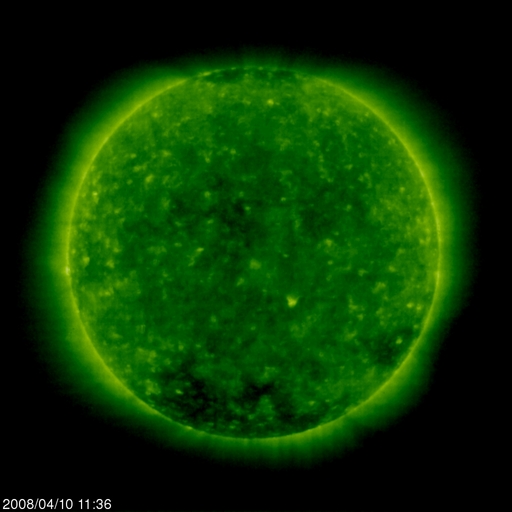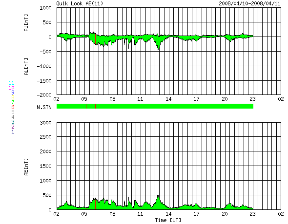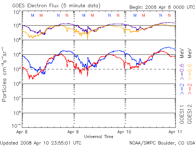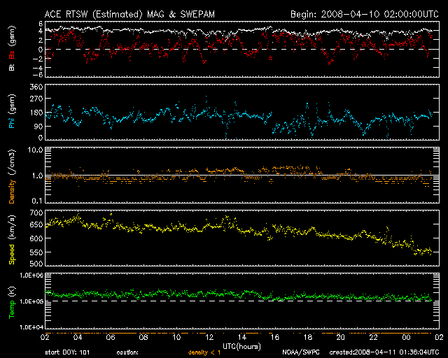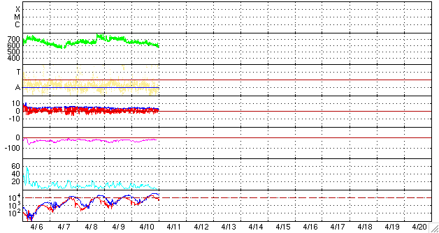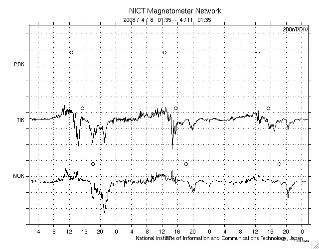 2008/ 4/11 10:37 更新 太陽風の速度はゆっくり下がって、550km/秒になりました。放射線帯が少し強まっています。 担当 篠原 高速の太陽風が続いています。 今回の高速風は4月5日に始まりましたので、6日経ったところです。 昨日、650km/秒だった速度は、ゆっくりと下がり、 今朝、11日7時(世界時10日22時)に600km/秒を割りました。 そこから下がるペースが早まって、3時間ほどで550km/秒に下がったところです。 太陽風の磁場強度は、4nTから3nTへ弱まりつつあるようです。 ここから速度は下がって行くのでしょうか。 27日周期の図で前周期の変化を見ると、 高速風はここからさらに6日間にわたって(3月21日にかけて)、500km/秒台を保ちました。 今周期も、太陽風の速度は下がりきらずに高速を保つのでしょうか。 SOHO EIT195の太陽写真は昨夜のものですが、大きなコロナホールは西に去っています。 現在は、南極に大きなコロナホールと、 太陽の中心やや北寄り(上側)に、とても淡いコロナホールらしい暗い領域が見えています。 磁気圏のオーロラ活動は少しずつ弱まっています。 AE指数は、300nTくらいの小規模変動が主です。 速度が500km/秒台に入っていますので、今後もこの程度の規模の活動となりそうです。 シベリア磁場データを見ると、1日ごとに変化が小さくなった様子がよく分かります。 放射線帯の高エネルギー電子は、少し強まって、 10,000の警戒レベルをしっかりと超えるようになりました。 太陽風が落ち着いてきているので、放射線帯の警戒状態はしばらく続きます。 太陽は無黒点のままで、フレア活動は全く見られません。 STEREOで先回りしても、明るい領域は見られず、無黒点は続きそうです。 SOHO衛星のEIT195カメラの映像。10日20時半(世界時10日11時半) (c) SOHO (ESA & NASA) ![]() ACEが観測した太陽風の磁場(1番上の枠、白線は全体の強度、赤線は南北成分) および、太陽風の密度(3番目の橙線)、速度(4番目の黄線) (c) NOAA/SWPC ![]() リアルタイムAE指数 下段のAEグラフの値が高くなると、オーロラ活動が活発化しています。 (c) 京都大学, NICT ![]() シベリアで観測された3日間の磁場データ 右側の3分の1が、昨日のデータになります。グラフが上がったり下がったりすると、オーロラ活動が活発化しています。 (c) NICT ![]() 27日の太陽周期に合わせたデータプロット 太陽が同じ面を地球に向けていた27日前の変化から、今後を予想することができます。 (c) NICT