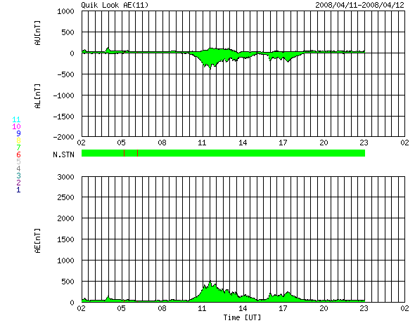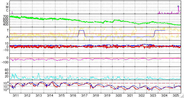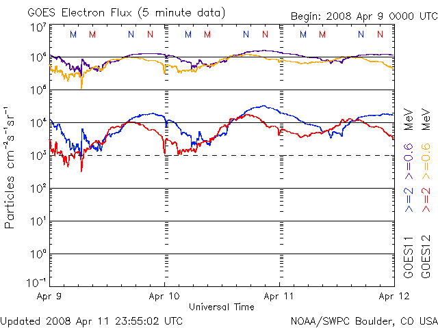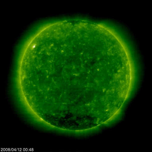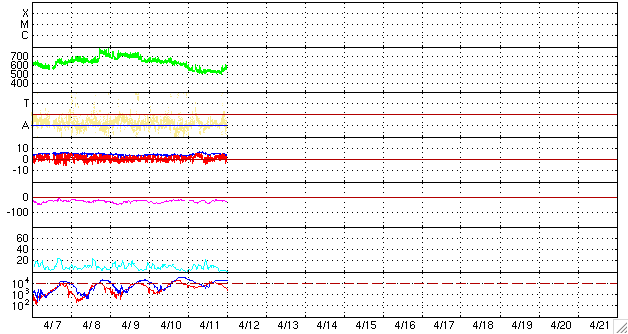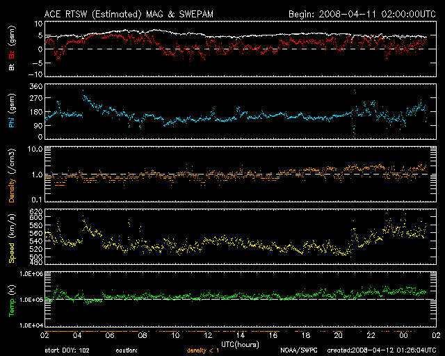 2008/ 4/12 10:27 更新 550km/秒前後の高速太陽風が続いています。磁気圏は比較的穏やかです。 担当 篠原 高速太陽風は、速度を下げずにがんばっています。 昨日のニュース以降も、540km/秒あたりの速度を保ち続け、 今朝は、また560km/秒へやや上がっています。 4nTを割りつつあった磁場強度も、5nTを回復しています。 大きく盛り上がることはありませんが、 前周期同様、500km/秒台の太陽風がしばらく続くのかもしれません。 引き続き注目しています。 磁気圏のオーロラ活動は、500nTくらいの比較的小規模の活動がひとつと、 その後に200nTの弱い活動がひとつ見えている程度です。 速度が下がって来ていることもありますが、 昨日は、太陽風磁場が比較的北寄りになっていたためでしょう。 南寄りに変われば、より連続的にオーロラが起こる様になります。 SOHO EIT195の太陽写真では、目立ったコロナホールはありませんので、 今後の太陽風が大きく乱れることはないでしょう。 しかし、速度が通常レベルまで下がるのかどうかは、まだよく分かりません。 磁気圏活動も、現状程度だと思います。 放射線帯高エネルギー電子も高い状態が続いています。 衛星の運用では引き続き注意が必要でしょう。 太陽はたいへん穏やかです。 黒点は今日も見られません。 SOHO衛星のEIT195カメラの映像。12日10時(世界時12日1時) (c) SOHO (ESA & NASA) ![]() ACEが観測した太陽風の磁場(1番上の枠、白線は全体の強度、赤線は南北成分) および、太陽風の密度(3番目の橙線)、速度(4番目の黄線) (c) NOAA/SWPC ![]() リアルタイムAE指数 下段のAEグラフの値が高くなると、オーロラ活動が活発化しています。 (c) 京都大学, NICT ![]() シベリアで観測された3日間の磁場データ 右側の3分の1が、昨日のデータになります。グラフが上がったり下がったりすると、オーロラ活動が活発化しています。 (c) NICT ![]() 27日の太陽周期に合わせたデータプロット 太陽が同じ面を地球に向けていた27日前の変化から、今後を予想することができます。 (c) NICT