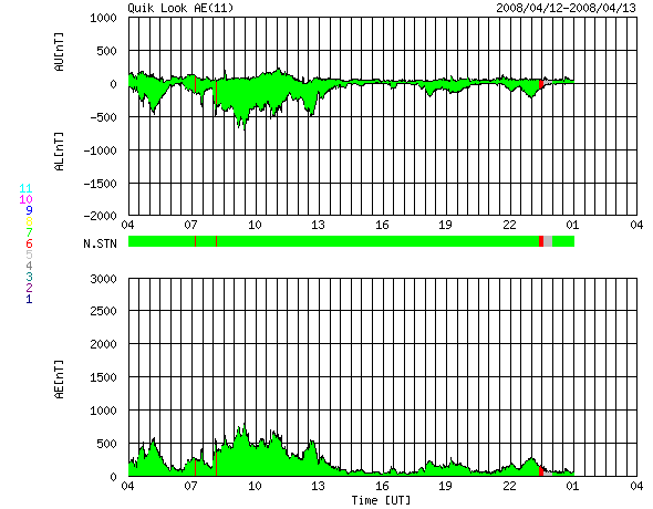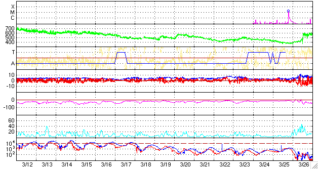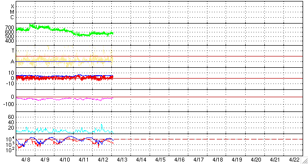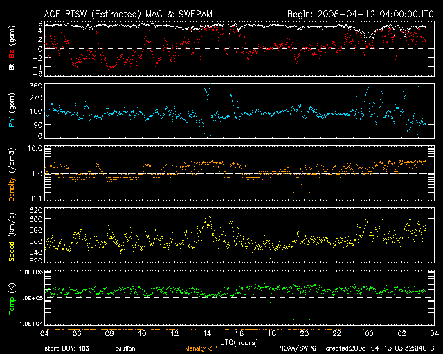 2008/ 4/13 12:33 更新 560km/秒の高速太陽風が続いています。北半球に新しい周期の磁場領域が現れています。 担当 篠原 今日も高速の太陽風が続いています。 昨日から560km/秒でほぼ安定した高速風が続いています。 太陽風の磁場強度も、5nTを保っています。 今周期もこのまま、500km/秒台の太陽風が数日間続きそうに思います。 磁場の南北成分は、ACEの図の前半で南寄り、中盤以降は北寄りに変わっています。 このため、AE指数を見ると、前半でオーロラ活動が発生し、後半は静穏になっています。 前半の活動は、500〜700nTと中規模でした。 今後も、太陽風磁場の南北成分の向きによって、 再び活発化したり、静穏になったりするでしょう。 SOHO EIT195の太陽コロナ写真を見ると、 太陽の北東(左上)寄りに、明るく光っている領域があります。 黒点にはなっていませんが、磁場の順番を見ると、 新しい24活動周期の性質を持った領域です。 こうやって、次第に新しい周期の顔が普通に見られるようになるのです。 太陽のフレア活動はたいへん穏やかです。 放射線帯高エネルギー電子は、磁気圏活動の影響でやや減少しています。 ちょうど10,0000の線を割るか割らないかというところです。 もうしばらく様子を見る必要があります。 SOHO衛星のEIT195カメラの映像。13日12時(世界時13日3時) (c) SOHO (ESA & NASA) ![]() SOHO衛星による太陽面の磁場。EIT195で北東(左上)に明るく見えている部分の磁場は、[白 黒]と新しい活動周期の向きです。 (c) SOHO (ESA & NASA) ![]() ACEが観測した太陽風の磁場(1番上の枠、白線は全体の強度、赤線は南北成分) および、太陽風の密度(3番目の橙線)、速度(4番目の黄線) (c) NOAA/SWPC ![]() リアルタイムAE指数 下段のAEグラフの値が高くなると、オーロラ活動が活発化しています。 (c) 京都大学, NICT ![]() シベリアで観測された3日間の磁場データ 右側の3分の1が、昨日のデータになります。グラフが上がったり下がったりすると、オーロラ活動が活発化しています。 (c) NICT ![]() 27日の太陽周期に合わせたデータプロット 太陽が同じ面を地球に向けていた27日前の変化から、今後を予想することができます。 (c) NICT