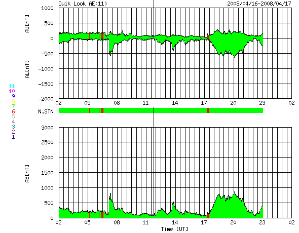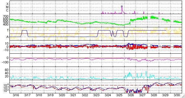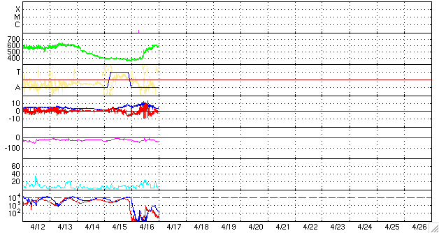ACEが観測した太陽風の磁場(1番上の枠、白線は全体の強度、赤線は南北成分) および、太陽風の密度(3番目の橙線)、速度(4番目の黄線) (c) NOAA/SWPC ![]() リアルタイムAE指数 下段のAEグラフの値が高くなると、オーロラ活動が活発化しています。 (c) 京都大学, NICT ![]() シベリアで観測された3日間の磁場データ 右側の3分の1が、昨日のデータになります。グラフが上がったり下がったりすると、オーロラ活動が活発化しています。 (c) NICT ![]() 27日の太陽周期に合わせたデータプロット 太陽が同じ面を地球に向けていた27日前の変化から、今後を予想することができます。 (c) NICT