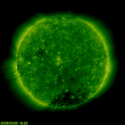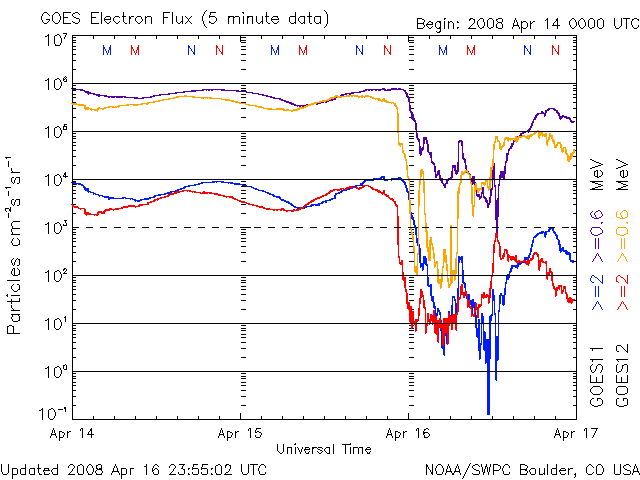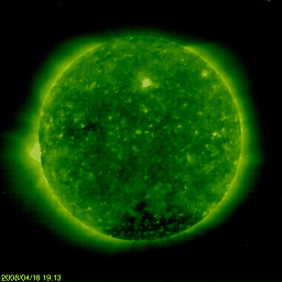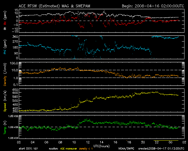 2008/ 4/17 10:06 更新 太陽風の速度が上昇し、600km/秒の高速風がやってきました。 担当 篠原 昨日の予想は見事に外れて、立派な高速太陽風がやって来ました。 現在の速度は570km/秒です。 速度が上がり始めたのは、昨夕、16日19時(世界時16日10時)頃でした。 400km/秒からスタートして、10時間ほどかけて600km/秒まで上昇しました。 速度が最も高まったのは、今朝、17日7時(世界時16日22時)です。 600km/秒を少し超えたところまで行き、 そこから下がって、現在の570km/秒となっています。 磁場強度は、速度が上がり始める頃に10nTまで強まり、 速度上昇後はゆっくりと弱まって、現在は5nTくらいです。 速度が高まったので、磁気圏のオーロラ活動も活発化しています。 500nTから800nTくらいの中規模の変動が起きています。 シベリアの磁場も、昨日(右側3分の1)になって急に変化が激しくなっています。 アラスカライブカメラの写真を1枚掲載します。 満月近いので、雪景が明るく見えています。 印象的なのは、この時刻に、地平線に朝焼けの赤い光が見えていることです。 暗くなる時間がどんどん短くなり、北半球のオーロラシーズンは終わろうとしています。 この高速風の原因ですが、太陽の南極側にあるコロナホールではないかと思われます。 27日周期の図で、前周期の変化を見ると、3月20日に小さな速度の山が見えています。 この頃は全体的に速度が高かったので、目立った変化ではなかったのですが、 この山がよりはっきりしてきたということでしょう。 SOHO EIT195(久しぶりに小さな写真が更新され始めました)で、 現在の太陽と、27日前の太陽を比べてみます。 南極のコロナホールの広がり方としては、それほど変わっていないようです。 この辺りの高速風の分布が今後どうなって行くのか、 以後の周期にかけて、注目したいところです。 太陽風磁場の様子から、地球は高速風領域の中盤にいると思います。 高速風は2-3日くらいだと思いますが、前回の変化からは予想が難しいところです。 磁場強度がもう一段下がると、終わりが近づいています。 放射線帯高エネルギー電子は、激しく変化して下がっています。 この後、上昇するかどうか、注目して下さい。 太陽では、990黒点群が消えて、無黒点になっています。 X線のグラフが小さく変化していますが、990群があった場所で発生したものだそうです。 SOHO EIT195では、太陽の東端に明るい領域が見えています。 前周期に3つ並んでいた活動領域が帰って来そうです。 アラスカのオーロラライブカメラによる、16日19時半(現地16日2時半、世界時16日10時半)のオーロラ。 (c) NICT/SALMON ![]() SOHO衛星のEIT195カメラの映像 (c) SOHO (ESA & NASA)