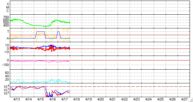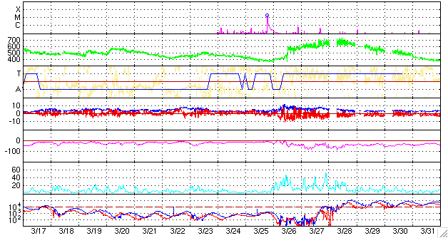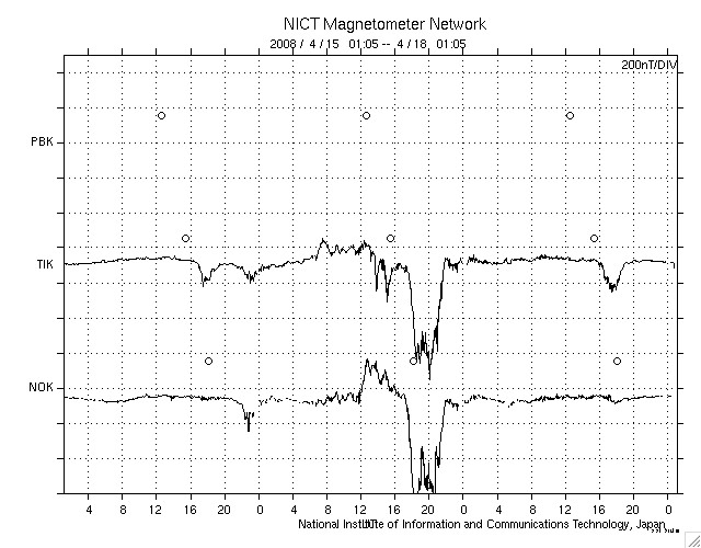 ACEが観測した太陽風の磁場(1番上の枠、白線は全体の強度、赤線は南北成分) および、太陽風の密度(3番目の橙線)、速度(4番目の黄線) (c) NOAA/SWPC ![]() リアルタイムAE指数 下段のAEグラフの値が高くなると、オーロラ活動が活発化しています。 (c) 京都大学, NICT ![]() シベリアで観測された3日間の磁場データ 右側の3分の1が、昨日のデータになります。グラフが上がったり下がったりすると、オーロラ活動が活発化しています。 (c) NICT ![]() 27日の太陽周期に合わせたデータプロット 太陽が同じ面を地球に向けていた27日前の変化から、今後を予想することができます。 (c) NICT