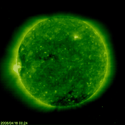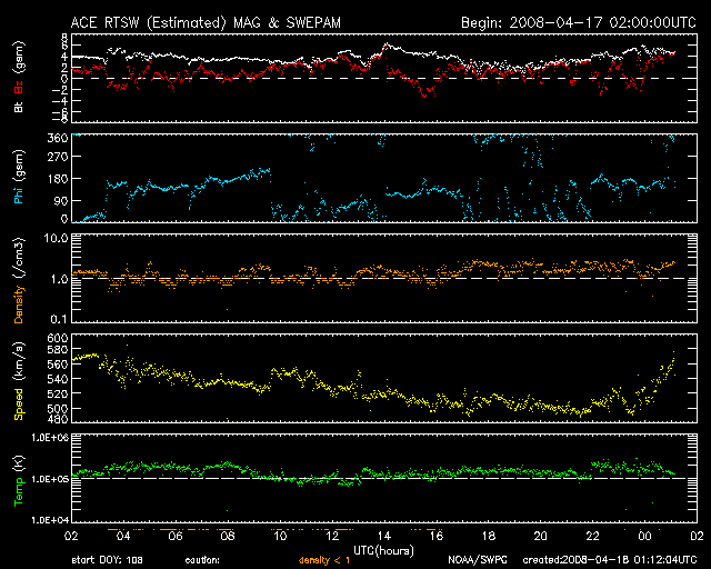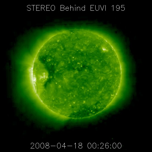 2008/ 4/18 10:06 更新 500km/秒の高速太陽風が続いています。磁気圏は比較的穏やかです。 担当 篠原 500km/秒台の高速太陽風が続いています。 昨日の600km/秒が最高だった様で、 その後はゆっくりと下がって500km/秒近くになっています。 しかし、ACEの最新データを見ると、また少し速度が上がったりしており、 そう簡単には下がって行かないのかもしれません。 磁場強度は4nT前後で、普通の状態です。 磁場の南北成分は、0nT付近か、北向きの時間が長くなっています。 そのため、磁気圏は高速風の影響をそれほど受けていません。 AE指数では、500nTにやっと届くくらいの小規模の活動が2つ見えているだけです。 太陽風磁場の傾向がこのままであれば、 磁気圏の状態もこのくらいで安定しているでしょう。 SOHO EIT195の太陽写真(小さい方の写真です)では、 太陽の中心やや東側に、淡いコロナホールが横に細長く見えています。 そして、そこから更に東の端に近づくと、 縦に長く伸びたコロナホールがあるようです。 27日周期の図によると、4日後の22日くらいから次の高速風がやってきます。 それは、これらの領域からの影響です。 STEREO衛星を使って、コロナホールを先回りして見てみましょう。 今日1枚めに掲載している写真は、STEREO Behindによる太陽コロナ写真です。 地球よりも、1日半ほど先回りして太陽を見ています。 横に伸びたコロナホールは既に太陽の中心にあり、 縦に長いコロナホールは、東の中間に来ています。 こちらはかなり大きくて、濃く見えています。 SOHOの前周期の写真と比較すると、2つのコロナホールの中間部が弱くなり、 左側のコロナホールは縦方向に成長している様に見えます。 そうすると、高速風は到来のタイミングが少し遅れたり、 後半に強まったりするかもしれません。 明日以降のSOHOの写真で、コロナホールはどのように見えるでしょうか。 放射線帯の高エネルギー電子は、低いレベルに留まっています。 今回程度の磁気圏の乱れだと、大きく増加することはないでしょう。 太陽は無黒点で、たいへん穏やかです。 STEREO衛星極紫外線望遠鏡EUVI195による太陽コロナ。18日9時半(世界時18日0時半)。1日半ほど先回りしています。 (c) NASA ![]() SOHO衛星のEIT195カメラの映像 (c) SOHO (ESA & NASA)
