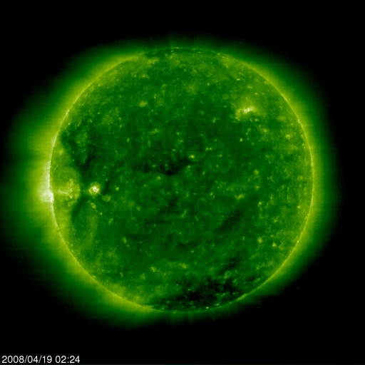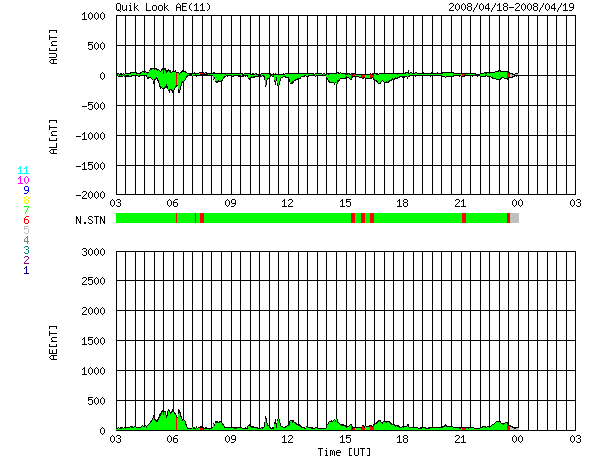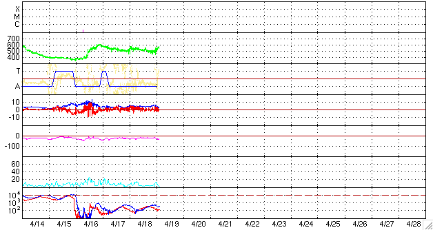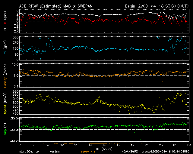 2008/ 4/19 11:43 更新 500km/秒台の高速太陽風が続いています。コロナホールが太陽の中心にさしかかっています。 担当 篠原 500km/秒台前半の高速太陽風が続いています。 ACEの図を見ると、初め550km/秒からゆっくりと500km/秒へ下がり、 最後にまた550km/秒を回復するという変化は、昨日とそっくりで、 更新されていないのかと思ってしまいます。 不安定な太陽風はまだ続きそうです。 高速風は続いていますが、磁気圏はかなり穏やかです。 AE指数では、目立った変化は見らません。 太陽風磁場の南北成分(赤線)が、0nTからやや北寄り(プラス側)になっているためでしょう。 太陽風磁場の傾向が変わらなければ、磁気圏活動もこのままでしょう。 SOHO EIT195の太陽風写真では、コロナホールが西(右)に進んでいます。 先頭の細いコロナホールは、太陽の中心にさしかかっています。 27日周期の図では、4月22日くらいから次の大きな高速風が回帰すると予想されます。 今日のSOHOの写真で、太陽の中心付近に見えているこの領域からの風の様です。 続いて、東側にかけてより大きなコロナホールがあります。 高速太陽風は、この幅程度に続くことになるでしょう。 さて、今日のSOHOの写真を昨日のSTEREOの写真と比較すると、 まだ昨日のSTEREOの方がコロナホールが進んで見えます。 STEREOが1日半くらい先の太陽を見ているという感覚を、 こういった比較でつかんでおくとよいでしょう。 放射線帯高エネルギー電子は、低いレベルのままです。 22日以降の高速風が来るまでは、このままになりそうです。 太陽は無黒点で、静穏です。 SOHO EIT195の東端(左端)が明るくなっています。 ここが上がって来た時に、黒点が見えているでしょうか。 SOHO衛星のEIT195カメラの映像。19日11時半(世界時19日2時半) (c) SOHO (ESA & NASA) ![]() ACEが観測した太陽風の磁場(1番上の枠、白線は全体の強度、赤線は南北成分) および、太陽風の密度(3番目の橙線)、速度(4番目の黄線) (c) NOAA/SWPC ![]() リアルタイムAE指数 下段のAEグラフの値が高くなると、オーロラ活動が活発化しています。 (c) 京都大学, NICT ![]() シベリアで観測された3日間の磁場データ 右側の3分の1が、昨日のデータになります。グラフが上がったり下がったりすると、オーロラ活動が活発化しています。 (c) NICT ![]() 27日の太陽周期に合わせたデータプロット 太陽が同じ面を地球に向けていた27日前の変化から、今後を予想することができます。 (c) NICT