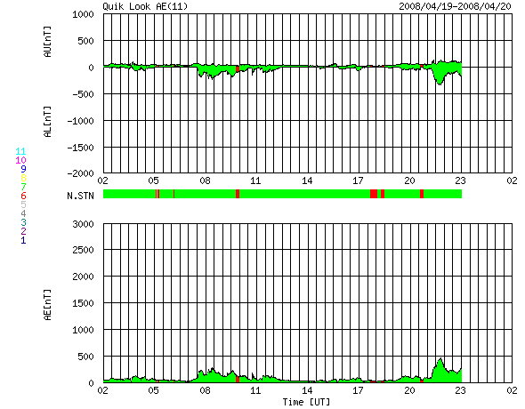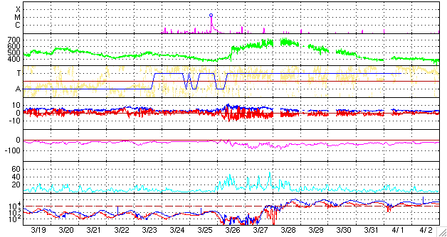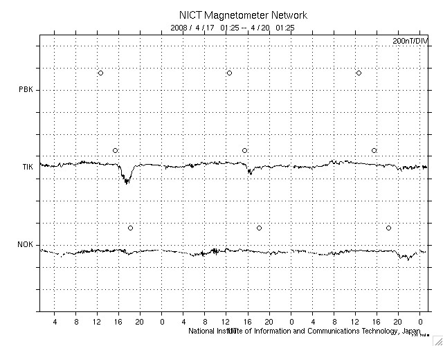 ACEが観測した太陽風の磁場(1番上の枠、白線は全体の強度、赤線は南北成分) および、太陽風の密度(3番目の橙線)、速度(4番目の黄線) (c) NOAA/SWPC ![]() リアルタイムAE指数 下段のAEグラフの値が高くなると、オーロラ活動が活発化しています。 (c) 京都大学, NICT ![]() シベリアで観測された3日間の磁場データ 右側の3分の1が、昨日のデータになります。グラフが上がったり下がったりすると、オーロラ活動が活発化しています。 (c) NICT ![]() 27日の太陽周期に合わせたデータプロット 太陽が同じ面を地球に向けていた27日前の変化から、今後を予想することができます。 (c) NICT