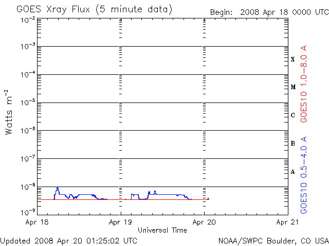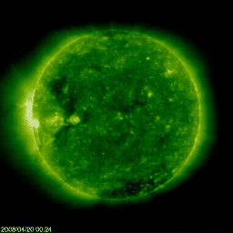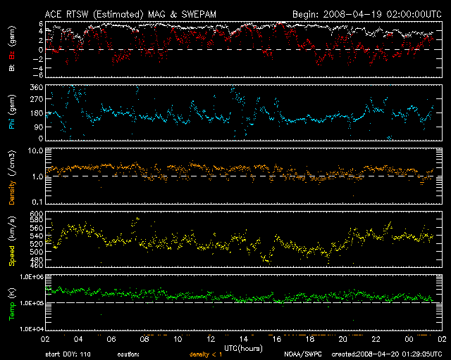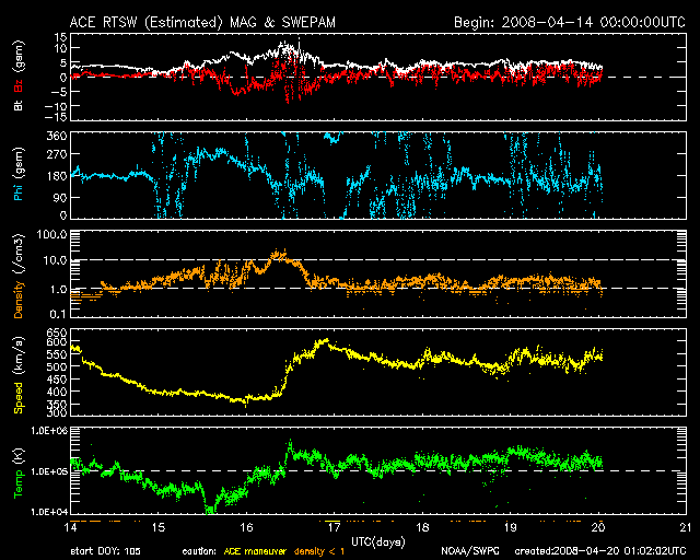 2008/ 4/20 10:30 更新 500km/秒台の高速太陽風が続いています。高速風は3日半続いています。 担当 篠原 520km/秒前後の高速状態で太陽風は安定しています。 16日に速度が上がってから、高速風は3日半続いています。 1週間の幅で太陽風をを見ると、1日毎に速度が下がりかけて、また上がってと、 波打つ様な変化をしています。 この状態はどこまで続くでしょうか。 磁気圏の活動は、概ね静穏です。 太陽風磁場は引き続き北寄りの傾向を示しています。 このため、速度は上がっていますが、地球への影響は小さいのです。 シベリアの磁場データも、3日間にわたって、ほとんど平坦になっています。 27日周期の図で前周期のセクターのグラフを見ると、 そろそろセクターの切り替わりがやってきそうです。 その頃に太陽風の様子に何か変化が見られるでしょうか。 現在の高速風の行方とともに、注目しています。 そして、22日くらいから次の高速風がやってきます。 SOHO EIT195では、太陽の中心に小さなコロナホールと、 東側に大きく広がったコロナホールが見えています。 太陽は無黒点のままです。 SOHO TIT195の写真では、太陽の東側に明るい領域がいくつか見えています。 太陽のこちら側に回って来ている2つの領域は、 前周期に987、988黒点群として見えていたものです。 既に、黒点はなくなっています。 一方、太陽の向こう側に明るく見えている領域は、 前周期に989黒点群があったところです。 やがてこちら側に回って来たとき、この領域はどうなっているでしょうか。 ACE衛星による1週間の太陽風データ。後半の3日半ほど、高速太陽風が続いている。 (c) NOAA/SWPC ![]() SOHO衛星のEIT195カメラの映像 (c) SOHO (ESA & NASA)