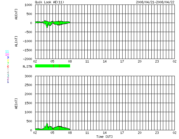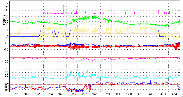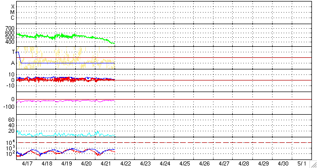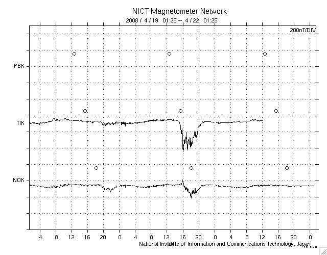 ACEが観測した太陽風の磁場(1番上の枠、白線は全体の強度、赤線は南北成分) および、太陽風の密度(3番目の橙線)、速度(4番目の黄線) (c) NOAA/SWPC ![]() リアルタイムAE指数 下段のAEグラフの値が高くなると、オーロラ活動が活発化しています。 (c) 京都大学, NICT ![]() シベリアで観測された3日間の磁場データ 右側の3分の1が、昨日のデータになります。グラフが上がったり下がったりすると、オーロラ活動が活発化しています。 (c) NICT ![]() 27日の太陽周期に合わせたデータプロット 太陽が同じ面を地球に向けていた27日前の変化から、今後を予想することができます。 (c) NICT