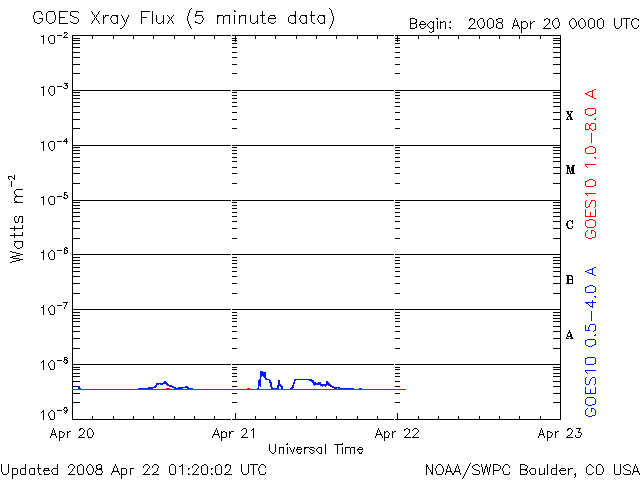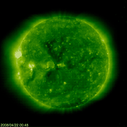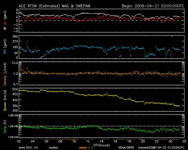 2008/ 4/22 10:24 更新 太陽風の速度は350km/秒に下がっています。これから高速太陽風がやって来るでしょう。 担当 篠原 ACE衛星によると、太陽風の速度が昨夜くらいからすっと下がり、 350km/秒に落ちています。 これまで5日間にわたって高速風が続いていましたが、 次の高速風の直前になって、急に低速風に変わりました。 太陽風磁場の強度もだいぶ弱まっています。現在、2nTくらいで推移しています。 磁気圏も穏やかです。 AEの図は途中で止まっていますが、 シベリア磁場データでは、昨日は平坦になっています。 27日周期で予想すると、これから高速太陽風がやって来ます。 今、太陽風の磁場強度は弱まっていますが、この後、増加に転じ、 それを追いかけるように速度が上昇を始めるでしょう。 始まりに、セクターの切り替わりも見られそうです。 太陽風磁場の大まかな向きが切り替わる変化です。 現在は、「太陽から地球方向(A)」ですが、 これが「地球から太陽(T)」方向にひっくり返るのです。 ACEの図なら水色の線に注目して下さい。 現在180度付近に見られますが、この線が上の端や下の端にくっつくようになります。 次の高速風は、前周期に活発なオーロラ活動が見られました。 アラスカのライブカメラは、暗くなる時間がますます短くなっています。 今シーズン最後のつもりでお楽しみください。 SOHO EIT195の太陽写真を見ると、 北半球側に逆三角形に広がったコロナホールが、太陽の中心に達しています。 この領域の影響は、これから3日くらい後にやって来ると考えられます。 しかし、前周期の太陽風では、このタイミングではむしろ高速風は弱まって行きました。 今回もそうなるのか、この領域からの影響が強まるのか、注目してみたいところです。 この写真では、太陽の東端に明るく光っている領域が見えます。 黒点にはなっていませんが、活動的な領域ができています。 北半球の低緯度にできていて、磁場の分布としては古いほうの23活動周期の性質です。 太陽のフレア活動は全く見られず、静穏です。 SOHO衛星のEIT195カメラの映像 (c) SOHO (ESA & NASA)