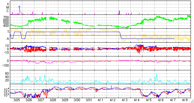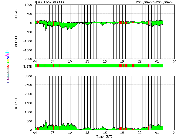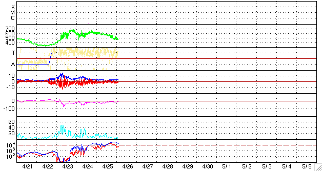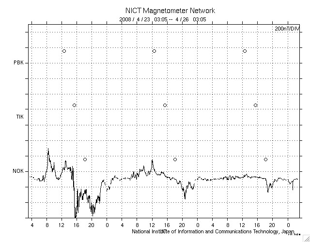 ACEが観測した太陽風の磁場(1番上の枠、白線は全体の強度、赤線は南北成分) および、太陽風の密度(3番目の橙線)、速度(4番目の黄線) (c) NOAA/SWPC ![]() リアルタイムAE指数 下段のAEグラフの値が高くなると、オーロラ活動が活発化しています。 (c) 京都大学, NICT ![]() シベリアで観測された3日間の磁場データ 右側の3分の1が、昨日のデータになります。グラフが上がったり下がったりすると、オーロラ活動が活発化しています。 (c) NICT ![]() 27日の太陽周期に合わせたデータプロット 太陽が同じ面を地球に向けていた27日前の変化から、今後を予想することができます。 (c) NICT