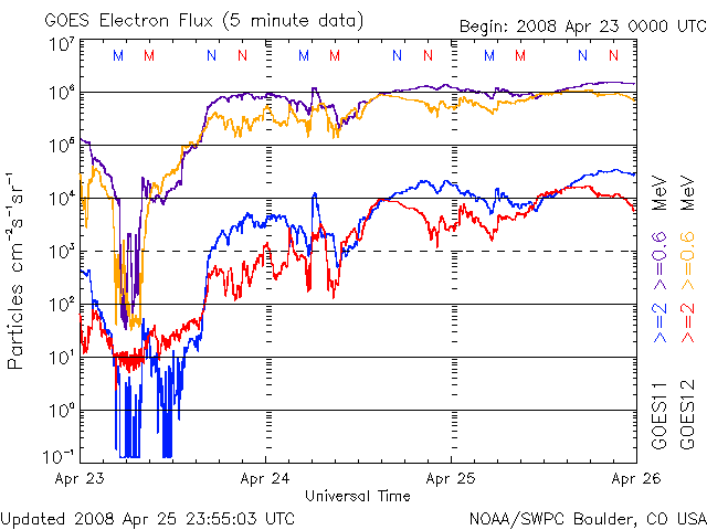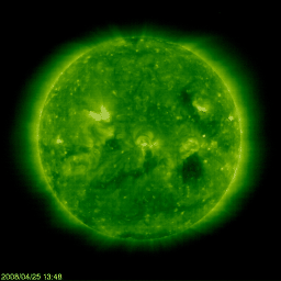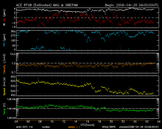 2008/ 4/26 12:10 更新 太陽風の速度は460km/秒に下がり、高速風は終わりに近づいています。放射線帯が強まっています。 担当 篠原 太陽風の速度(ACEの図の黄色線)はゆっくりと下がって、高速風は終盤に向かっています。 現在の速度は460km/秒で、やや高めの速度です。 昨日はまだ600km/秒ありましたが、もうその勢いはありません。 磁場強度(白線)も3nT前後で落ち着いていて、 高速風領域の後半にいることが分かります。 太陽風磁場の南北成分(赤線)は、比較的南寄りですが、 振幅は-2nT以下と小さく、地球の磁気圏への影響は弱まっています。 AE指数の変化は、大きくても300nTくらいとなっていて、 磁気圏活動はだいたい落ち着いています。 太陽風の速度が下がってしまいましたから、この後は更に静かになるでしょう。 (AE指数とは、オーロラが活動する時に電離層を流れる電流の大きさを表す数値です) この後、太陽風の速度は400km/秒台前半へと下がって行くでしょう。 そして、これから5日ほど、4月30日くらいまで穏やかな風が続きます。 次の太陽風の乱れは、5月1-2日くらいから始まるでしょう。 27日周期の図では、前周期、4月4日に始まった高速風の回帰です。 発生源のコロナホールは、まだ見にくいです。 明日、どんな姿に見えるでしょうか。 放射線帯高エネルギー電子は、GOES11,12の両衛星で10,000をしっかりと超えています。 放射線が強まっていますから、衛星の運用では注意が必要です。 この状態は、次の乱れが来るまで、4月30日までは続きそうです。 太陽は無黒点になっています。 X線の強度は下がり、とても静穏です。 SOHO衛星のEIT195カメラの映像 (c) SOHO (ESA & NASA)