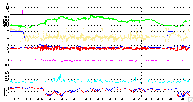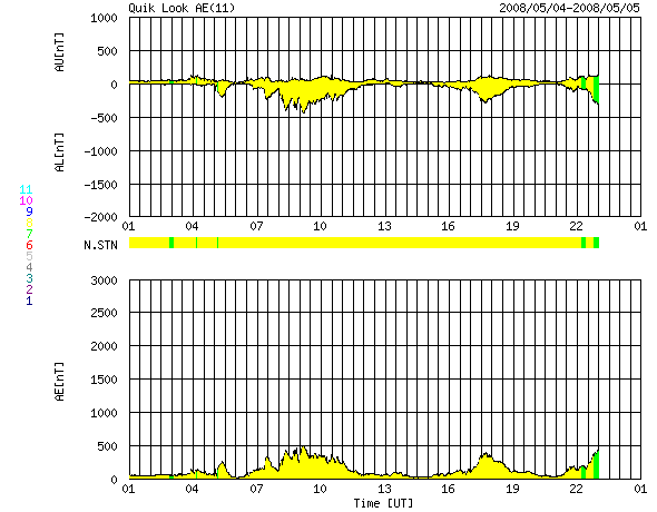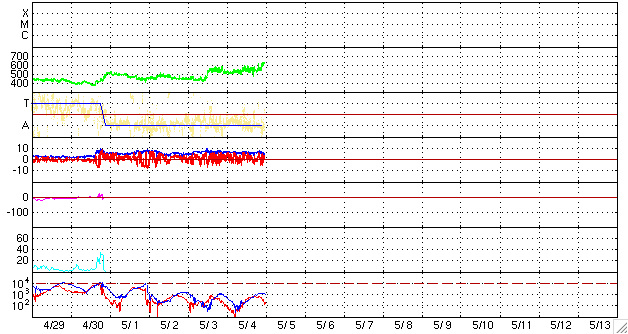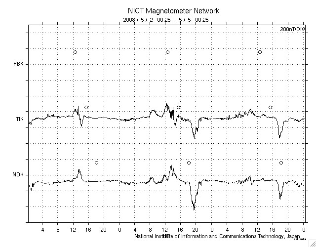 ACEが観測した太陽風の磁場(1番上の枠、白線は全体の強度、赤線は南北成分) および、太陽風の密度(3番目の橙線)、速度(4番目の黄線) (c) NOAA/SWPC ![]() リアルタイムAE指数 下段のAEグラフの値が高くなると、オーロラ活動が活発化しています。 (c) 京都大学, NICT ![]() シベリアで観測された3日間の磁場データ 右側の3分の1が、昨日のデータになります。グラフが上がったり下がったりすると、オーロラ活動が活発化しています。 (c) NICT ![]() 27日の太陽周期に合わせたデータプロット 太陽が同じ面を地球に向けていた27日前の変化から、今後を予想することができます。 (c) NICT