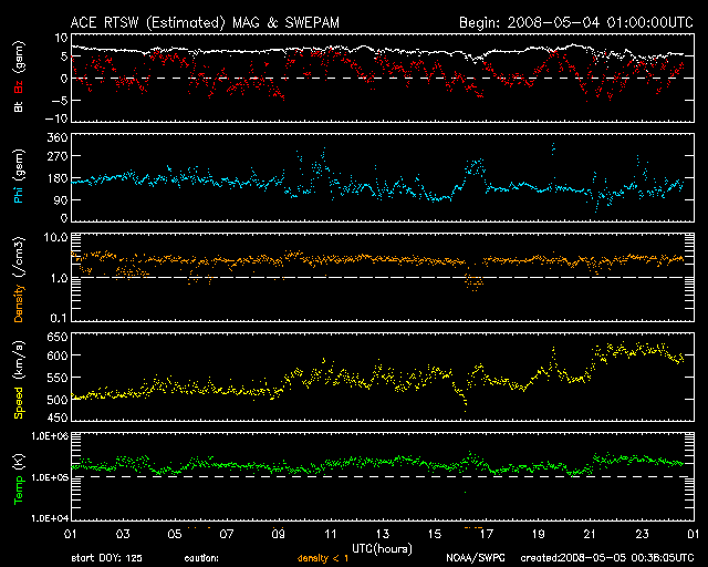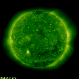 2008/ 5/ 5 09:38 更新 太陽風の速度が600km/秒に上昇しています。小規模の磁気圏活動が起きています。 担当 篠原 太陽に昨日出現した南半球の黒点群は、993黒点群と番号がつけられています。 昨日のお昼頃の写真ですが、SOHOの太陽全面像を最初に掲載します。 黒点は、太陽の左下(南東)にとても小さく見えています。 ヒントをもらわないと、見つけるのも難しいほど小さな姿です。 (磁場の様子などは、昨日掲載した写真をご覧下さい) 今朝に入って、太陽風の速度が一段上がり、600km/秒になっています。 コロナホールの広い部分から噴き出した風が、地球へ届き始めたようです。 27日周期の図で、前周期の変化を見ると、 高速風は、今日に対応する4月8日以降も、1週間くらい続いています。 従って、今周期も高速風はまだまだ続く可能性があると考えられます。 現在の磁気圏活動は、 AE指数で500nT弱の小規模活動が2回と、3つめがちょうど見え始めているところです。 やや活発というところでしょうか。 しかし、速度が600km/秒台に上がったことや、磁場強度は5nTを保っていますので、 南向き磁場の振れ具合によっては、中規模活動を活発に起こす様になるかもしれません。 もう、アラスカのライブカメラでその様子を見ることはできなくなってしまいましたが、 AEのグラフを見ながら、極域の空の様子を想像して楽しんでください。 放射線帯の高エネルギー電子は、1000くらいで安定しています。 太陽風の速度が上がったことで、増加を始めるかもしれません。 しばらく注目してください。 南半球に初めて出現した、第24活動周期の993黒点群。南東(左下)にとても小さく見えている。5月4日13時(世界時5月4日5時)。 (c) SOHO (ESA & NASA) ![]() SOHO衛星のEIT195カメラの映像 (c) SOHO (ESA & NASA)