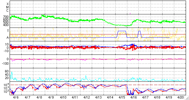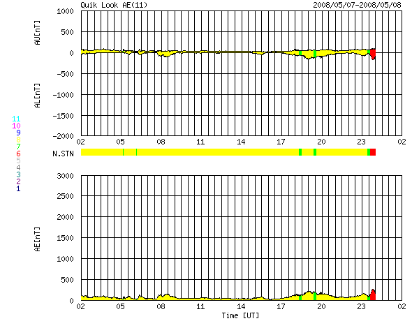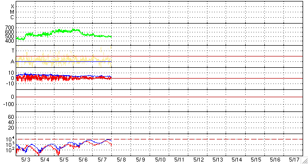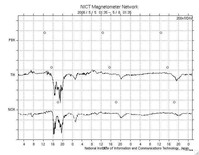 ACEが観測した太陽風の磁場(1番上の枠、白線は全体の強度、赤線は南北成分) および、太陽風の密度(3番目の橙線)、速度(4番目の黄線) (c) NOAA/SWPC ![]() リアルタイムAE指数 下段のAEグラフの値が高くなると、オーロラ活動が活発化しています。 (c) 京都大学, NICT ![]() シベリアで観測された3日間の磁場データ 右側の3分の1が、昨日のデータになります。グラフが上がったり下がったりすると、オーロラ活動が活発化しています。 (c) NICT ![]() 27日の太陽周期に合わせたデータプロット 太陽が同じ面を地球に向けていた27日前の変化から、今後を予想することができます。 (c) NICT