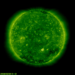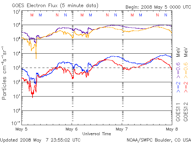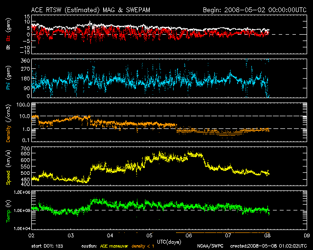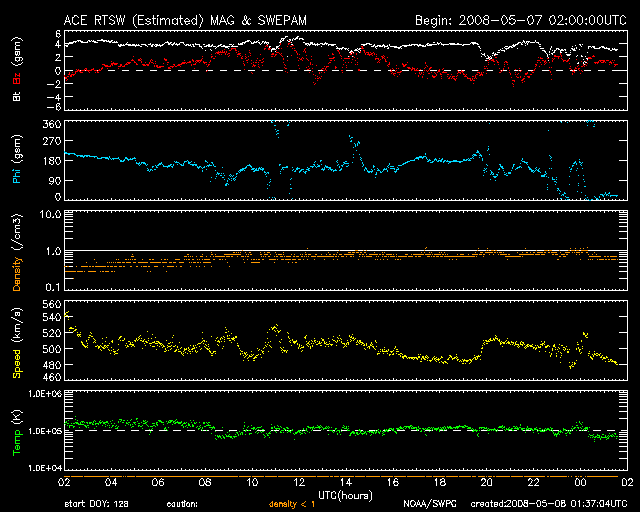 2008/ 5/ 8 10:39 更新 500km/秒前後の高速太陽風が続いています。磁気圏は穏やかです。 担当 篠原 太陽風の速度は、500km/秒で安定しています。 高速状態は続いていますが、それほど高い速度ではありません。 この1週間の太陽風速度の変化を見てみましょう。 今日の1枚めの図の黄色線を見て下さい。 太陽風の速度は、この図の1日前くらいから上がり始め、 この図の開始時点で既に450km/秒を超えています。 普段の高速風だと、最初に一気に速度が上がり、 その後、安定した状態がしばらく続くのですが、 今回は、1日ごとに不規則に上昇していて、ずいぶん様子が違います。 このため、いつもと違って、この後の展開が読みにくくなっています。 現在の磁気圏活動は、とても静かです。 AE指数に目立った変化はなく、シベリア磁場データも穏やかです。 太陽風磁場の南北成分が、北寄りに推移していることが影響しているのだと思います。 速度はそこそこあるので、磁場が南を向けば、小規模のオーロラ活動は起きるはずです。 太陽風は、もうしばらく高速状態が続きそうです。 前周期の変化を見ると、もう3日ほど高めの速度が続きそうです。 その後、一旦速度が下がりますが、2日ほどですぐに上がりそうです。 記事の最初に、この後の展開が読みにくいと書きましたが、 前々周期あたりから、太陽風の速度分布が大きく動いている印象があります。 500km/秒台の高速風の期間が長くなり、低速風の期間がどんどん減っています。 その一方、高速風の山は低くなって、全体的に変化のめりはりがなくなっているのです。 例えば、昨日までの27日間を振り返ると、 およそ22日間が、高速風(450-500km/秒を超える速度)になっていて、 400km/秒付近の穏やかな期間は、たった5日間に減っています。 ずっと高速風が吹いているという印象です。 太陽風がこの後どのように動いて行くのか、今月、来月と注目してみてください。 放射線帯の高エネルギー電子は、少し上昇しています。 10,000には達していませんが、かなり高まっていますので、 衛星の運用ではしばらく注意が必要でしょう。 今日以降も、もう少し上昇するかもしれません。 太陽は無黒点で、とても穏やかです。 ACE衛星による7日間の太陽風。速度は黄色。 (c) NOAA/SWPC ![]() SOHO衛星のEIT195カメラの映像 (c) SOHO (ESA & NASA)