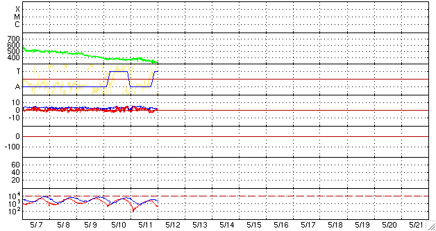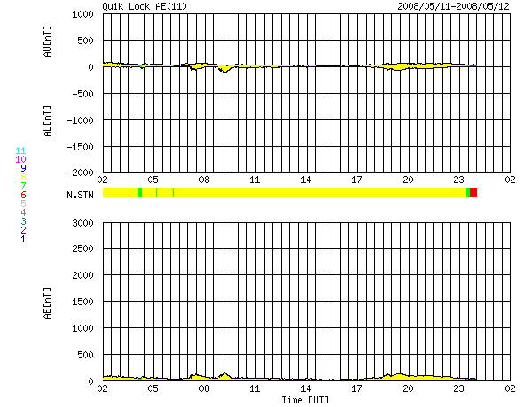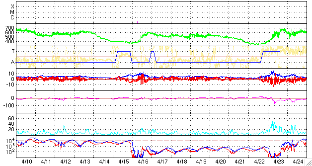 ACEが観測した太陽風の磁場(1番上の枠、白線は全体の強度、赤線は南北成分) および、太陽風の密度(3番目の橙線)、速度(4番目の黄線) (c) NOAA/SWPC ![]() リアルタイムAE指数 下段のAEグラフの値が高くなると、オーロラ活動が活発化しています。 (c) 京都大学, NICT ![]() シベリアで観測された3日間の磁場データ 右側の3分の1が、昨日のデータになります。グラフが上がったり下がったりすると、オーロラ活動が活発化しています。 (c) NICT ![]() 27日の太陽周期に合わせたデータプロット 太陽が同じ面を地球に向けていた27日前の変化から、今後を予想することができます。 (c) NICT