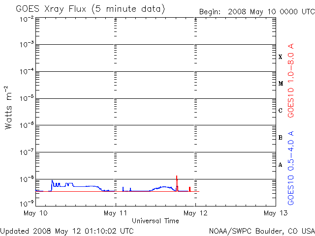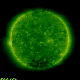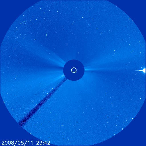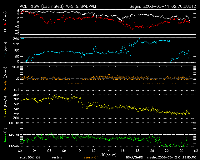 2008/ 5/12 10:14 更新 太陽風は低速風になっています(320km/秒)。明日くらいから高速風が始まります。 担当 篠原 SOHOのLASCO C3カメラに金星が入ってきました。 今日の1枚めの写真の右端に見える明るい星です。 これからゆっくりと視野を左へ横切って行きます。 一方、視野の左からは、もうすぐプレアデス星団(すばる)が見えて来ます。 こちらは右へ動いて行きます。 しばらくLASCO C3の写真がにぎやかになります。 太陽風は、速度が320km/秒へ下がり、低速風になっています。 磁場強度も、2nT前後へ弱まっています。 このため、磁気圏はとても静穏です。 AE指数、シベリア磁場データのどちらも、 ほとんど変化のない静かなグラフになっています。 この穏やかな風は、今日いっぱいは続くでしょう。 そして、明日の午後か、明後日くらいから高速太陽風がやって来そうです。 27日周期の図を見て下さい。 前周期の、4月16-21日にかけて見られている速度の山が、これから回帰して来る高速風です。 この時は、それほど大きな乱れではありませんでした。 前後の期間にこれよりも高い速度の山があるので、一段と小さな山に見えてしまいます。 発生源と思われるコロナホールは、SOHO EIT195で太陽の南極付近に見えています。 SOHO EIT195では、太陽の東端に明るい領域が見えています。 まだ向こう側に隠れているみたいですが、活動的な領域があります。 黒点があるかどうかはまだ分かりませんが、注目してみましょう。 放射線帯高エネルギー電子は、ゆっくりと減少しています。 高速風が来るまでは、このまま穏やかに減って行くでしょう。 SOHO LASCO C3カメラの視野に金星が入って来ました。 (c) SOHO (ESA & NASA) ![]() SOHO衛星のEIT195カメラの映像 (c) SOHO (ESA & NASA)