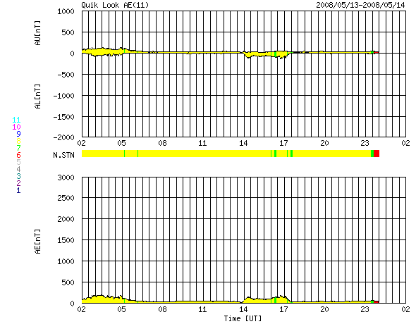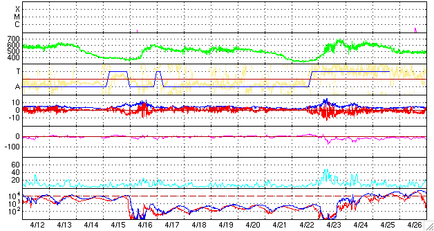 ACEが観測した太陽風の磁場(1番上の枠、白線は全体の強度、赤線は南北成分) および、太陽風の密度(3番目の橙線)、速度(4番目の黄線) (c) NOAA/SWPC ![]() リアルタイムAE指数 下段のAEグラフの値が高くなると、オーロラ活動が活発化しています。 (c) 京都大学, NICT ![]() シベリアで観測された3日間の磁場データ 右側の3分の1が、昨日のデータになります。グラフが上がったり下がったりすると、オーロラ活動が活発化しています。 (c) NICT ![]() 27日の太陽周期に合わせたデータプロット 太陽が同じ面を地球に向けていた27日前の変化から、今後を予想することができます。 (c) NICT