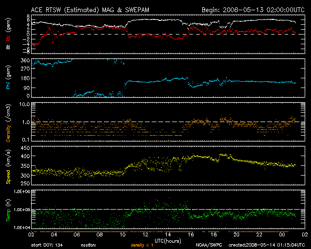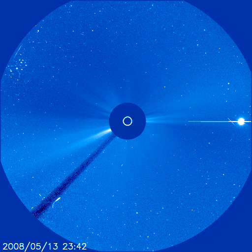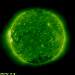 2008/ 5/14 10:15 更新 太陽風は300km/秒台後半に上がりましたが、低速のままです。LASCO C3に金星とすばるが見えています。 担当 篠原 宇宙天気の話題ではありませんが、 SOHO衛星のLASCO C3カメラの視野に、金星とプレアデス星団(すばる)が見えてきました。 金星については、一昨日に紹介しましたが、 それに続いて、宇宙天気の春の風物詩(?)、すばるの登場です。 すばるは、これから2週間ほどかけてゆっくりと視野を横切って行きます。 一方、金星は、6月9日に太陽と重なる「外合」を迎えるとのことで、 これから2ヶ月近く、視野の中に留まるようです。 さて、太陽風は、300km/秒台の低速状態が続いています。 まだ高速風は始まっていません。 ACEの観測によると、昨夜、13日19時(世界時13日10時)から、 太陽風の様子が少し変わっています。 磁場強度が6nTに強まり、速度が350〜400km/秒に上がりました。 セクターの切れ目だったようで、 磁場の方向を示す水色の線が、上下の端から中央へと飛んでいます。 27日周期の図の、セクターのグラフも見て下さい。 地球は、前周期に高速風だった領域に入っている様ですが、 速度の大きな上昇はまだです。 磁場強度は6nTに上がったままなので、 これから更に速度の上昇が始まるのかもしれません。 あるいは、高速風は来ないのでしょうか? この後のACEの図に注目して下さい。 太陽風が低速のため、磁気圏は穏やかです。 AE指数には目立った変化は見られません。 SOHO EIT195を見ると、太陽の東端から明るく光る活動領域が上がって来ました。 しかし、黒点はありませんでした。 GOESのX線の変化は落ち着いています。 活動度もそれほど高くないようです。 EIT195では、もうひとつ向こう側から明るい領域が上がって来ています。 こちらにも注目して下さい。 SOHO LASCO C3カメラの右に金星が、左にプレアデス星団(すばる)が見えています。 (c) SOHO (ESA & NASA) ![]() SOHO衛星のEIT195カメラの映像 (c) SOHO (ESA & NASA)