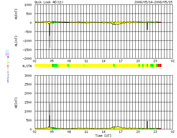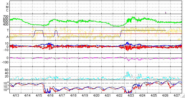 ACEが観測した太陽風の磁場(1番上の枠、白線は全体の強度、赤線は南北成分) および、太陽風の密度(3番目の橙線)、速度(4番目の黄線) (c) NOAA/SWPC ![]() リアルタイムAE指数 下段のAEグラフの値が高くなると、オーロラ活動が活発化しています。 (c) 京都大学, NICT ![]() シベリアで観測された3日間の磁場データ 右側の3分の1が、昨日のデータになります。グラフが上がったり下がったりすると、オーロラ活動が活発化しています。 (c) NICT ![]() 27日の太陽周期に合わせたデータプロット 太陽が同じ面を地球に向けていた27日前の変化から、今後を予想することができます。 (c) NICT