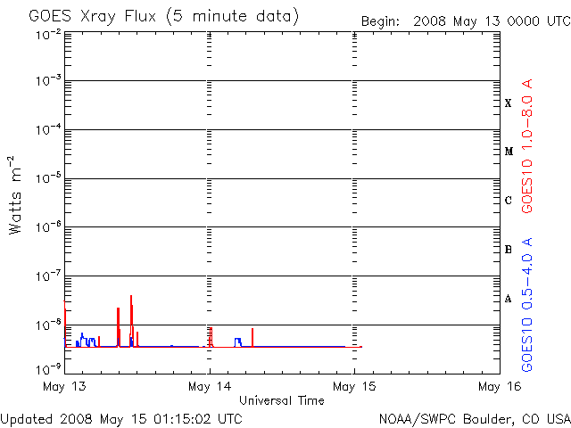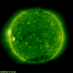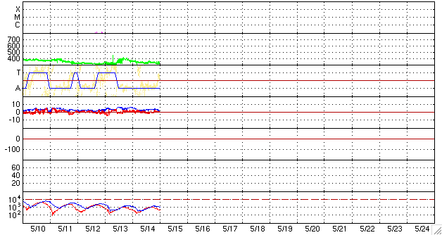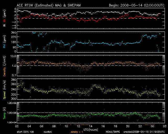 2008/ 5/15 10:06 更新 太陽風は330km/秒と低速で、磁気圏はとても穏やかです。 担当 篠原 穏やかな太陽風が続いています。 速度は330km/秒と低速のまま落ち着いています。 磁場強度も、2-4nTくらいに弱まっていて、この後に変化が来る様子は見えません。 前周期に見られた、高速風の領域は消えてしまった様です。 太陽風が低速のため、磁気圏もとても静かです。 AE指数はずっと平らになっています。 シベリア磁場データは、3日間にわたって平坦になっていて、 観測をしていないかの様です。 27日周期の図を見て下さい。 この状況だと、次の擾乱は、前周期の4月23日に始まった高速風の回帰になりそうです。 今周期では、5月20日に相当します。 SOHO EIT195を見ると(左が現在の太陽)、 太陽の中心から東に向かって、コロナホールの細い筋が横に伸びています。 この細長いコロナホールは、前周期にも見られていましたが(右の写真)、 今回は南側へ大きくせり出しています。 この変化の影響が太陽風に見られるのかどうか。 次の高速風は5月20日と予想しましたが、 あるいは、今回はもう少し早く影響がやって来たりするかもしれません。 太陽は無黒点で、X線のグラフも下がりきっていて、とても静穏です。 明日には、EIT195で太陽の向こう側に明るく見えている領域が、こちらに見えて来そうです。 SOHO衛星のEIT195カメラの映像 (c) SOHO (ESA & NASA)
