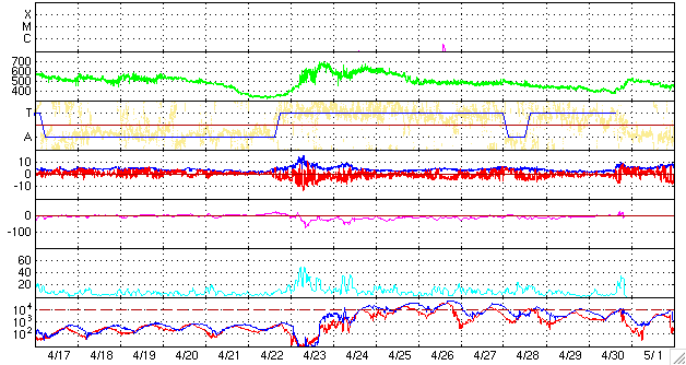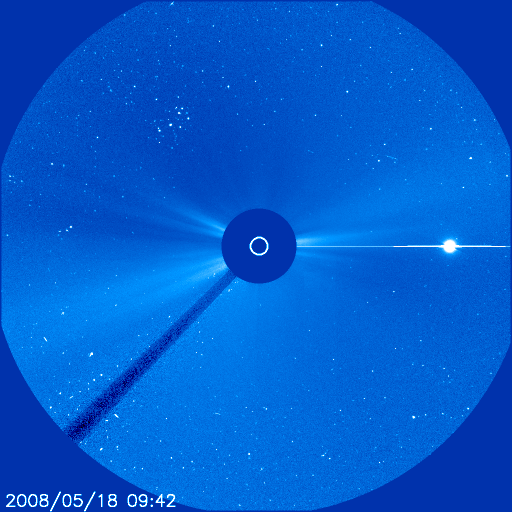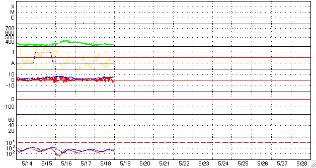 2008/ 5/19 09:59 更新 太陽風の速度は遅く(340km/秒)、磁気圏は静穏です。これから高速太陽風がやって来るでしょう。 担当 篠原 SOHO衛星のLASCO C3カメラに見えていたプレアデス星団(すばる)が、 次第に太陽に近づいています(1枚めの写真)。 右に見えている明るい星は、金星です。 こちらのほうが先にカメラの視野に入って来ましたが、視野の中の移動はゆっくりです。 太陽では、一旦消えていた994黒点群が復活しています。 太陽写真の中心から右下のあたりを見て下さい。 黒い点がいくつか見えています。 一方、995、996のふたつの黒点群はほとんど見えなくなっています。 GOESのX線グラフは、全く変化がなく、穏やかです。 994群が盛り返したといっても、今のところはフレア活動にはつながっていません。 この後どう変化するか、注目してください。 太陽風は、速度340km/秒と低速風が続いています。 昨日の午後から、密度(橙色線)が上昇して、高速風が近づいているのかと思いましたが、 今のところ速度に変化はありません。 現在は、密度の上昇は一段落していますが、その後、磁場強度が強まりそうな気配を見せています。 これから高速風がやって来ると予想しているので、太陽風の変化に少し敏感になっています。 磁気圏の活動はほとんど見られず、とても静かです。 AE指数、シベリアともに全く変化が見られません。 太陽風の最新部(右端)を見ると、磁場の南北成分が-5nTと南向きに大きく偏っています。 このため、これから一時的に磁気圏活動が強まりそうです。 ただし、速度が遅いですから、小規模の活動にとどまるでしょう。 今日は、SOHO、STEREOともに太陽コロナの写真が更新されていません。 2枚めに、STEREO衛星の昨日と同じ写真を掲載します。 全く同じでは面白くありませんので、サイズを大きくしてみましょう。 ほとんど直角に折れ曲がったコロナホールの形が印象的です。 STEREOが少し先回りをしていることを考えると、 だいたい今ぐらいに地球から太陽を見ると、こんな様子だと思います。 (黒点群の位置と、コロナの明るい領域の位置がだいたい同じに見えます) コロナホールの先頭(右端)は、太陽の西半分くらいにせり出していて、 高速風の影響がそろそろやってくることを示しています。 SOHO LASCO C3カメラでは、プレアデス星団(すばる)が太陽に近づいています。右の明るい星は、金星です。 (c) SOHO (ESA & NASA) ![]() STEREO衛星が撮影した、太陽コロナの写真。17日13時(世界時17日4時)。 (c) NASA ![]() SOHO衛星のMDIカメラによる太陽黒点 (c) SOHO (ESA & NASA) ![]() GOES衛星の太陽X線データ (c) NOAA/SWPC ![]() ACEが観測した太陽風の磁場(1番上の枠、白線は全体の強度、赤線は南北成分) および、太陽風の密度(3番目の橙線)、速度(4番目の黄線) (c) NOAA/SWPC ![]() リアルタイムAE指数 下段のAEグラフの値が高くなると、オーロラ活動が活発化しています。 (c) 京都大学, NICT ![]() シベリアで観測された3日間の磁場データ 右側の3分の1が、昨日のデータになります。グラフが上がったり下がったりすると、オーロラ活動が活発化しています。 (c) NICT ![]() 27日の太陽周期に合わせたデータプロット 太陽が同じ面を地球に向けていた27日前の変化から、今後を予想することができます。 (c) NICT