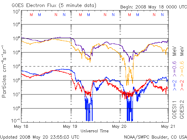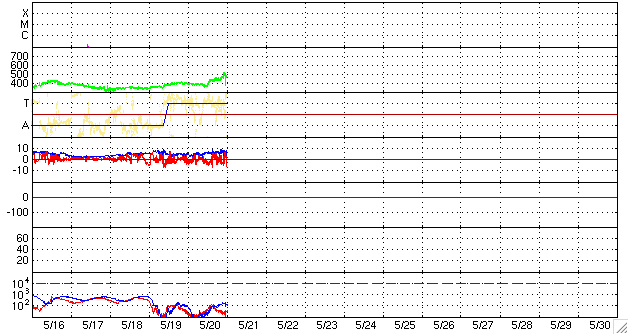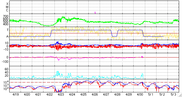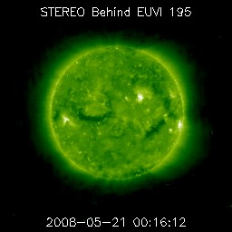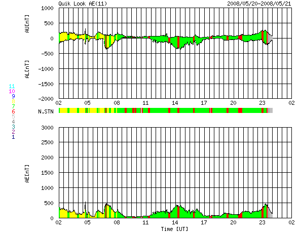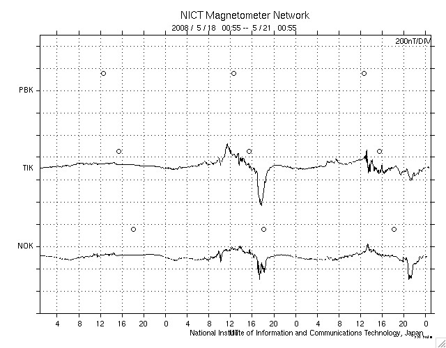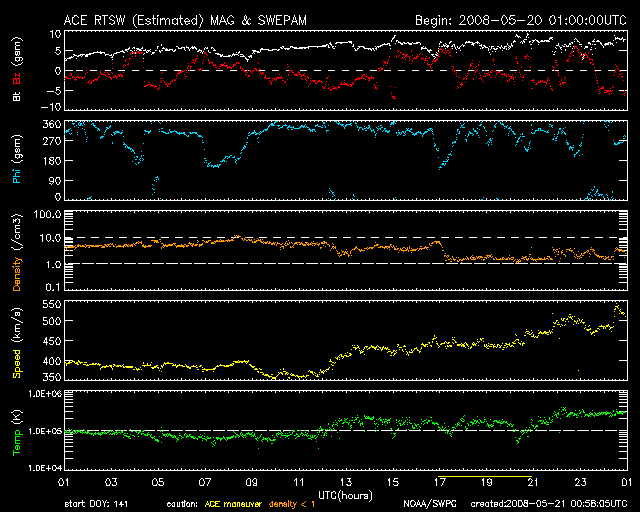 2008/ 5/21 10:00 更新 太陽風の速度が520km/秒に上昇しています。もうしばらく上がりそうです。 担当 篠原 前周期より半日ほど遅れて、高速太陽風が始まりました。 昨夜、20日22時(世界時20日13時)頃から太陽風の速度が上がり始め、 半日ほど経って、現在520km/秒に上がっています。 上がり幅としては、まだそれほどでもありません。 磁場強度は、7nTに強まっています。 現在も強まったままなので、速度はもうしばらく上昇しそうです。 磁気圏では、AE指数で500nT弱の小規模活動が続いています。 磁場強度が強まって、-5nTくらいの南向き磁場が頻繁に見られているためでしょう。 速度が上がって来たので、今後は中規模の活動くらいに高まるのではないでしょうか。 高速風は、これから3日程度続くのではないかと思います。 SOHO衛星の更新が止まっているので、今日もSTEREOのコロナ写真を掲載します。 この衛星から見て、西側(右側)へ過ぎ去りつつあるコロナホールが、 現在の高速風の発生源です。 地球から見ると、2日後くらいにこの状態になると考えて下さい (少しずつ地球との距離が広がっているようです)。 23日頃に、コロナホールから最後の高速風が来ることになりそうです。 そして、次のコロナホールが太陽の中心に近づいています。 ここからの高速風は、5日後くらいになるでしょう。 放射線帯の高エネルギー電子は、低い状態です。 高速風がもう少し強まって来ると、上昇に対する注意が必要となります。 太陽は、SOHOの写真が更新されていないので、昨日と同じ写真を掲載します。 STEREOのEUVI195の写真から見て、目立った変化はないでしょう。 GOESのX線グラフも静かなままです。 STEREO衛星極紫外線望遠鏡EUVI195による太陽コロナ。21日9時(世界時21日0時)。2日ほど先回りしています。 (c) NASA ![]() ACEが観測した太陽風の磁場(1番上の枠、白線は全体の強度、赤線は南北成分) および、太陽風の密度(3番目の橙線)、速度(4番目の黄線) (c) NOAA/SWPC ![]() リアルタイムAE指数 下段のAEグラフの値が高くなると、オーロラ活動が活発化しています。 (c) 京都大学, NICT ![]() シベリアで観測された3日間の磁場データ 右側の3分の1が、昨日のデータになります。グラフが上がったり下がったりすると、オーロラ活動が活発化しています。 (c) NICT ![]() 27日の太陽周期に合わせたデータプロット 太陽が同じ面を地球に向けていた27日前の変化から、今後を予想することができます。 (c) NICT