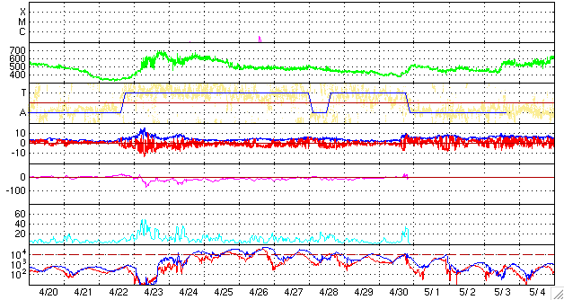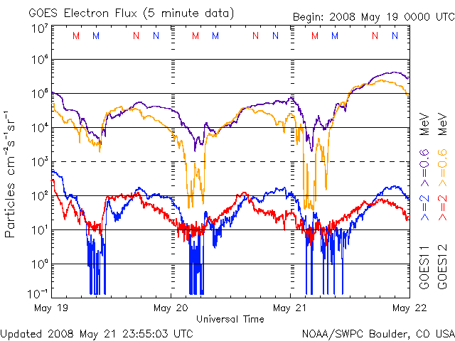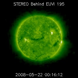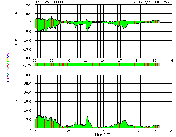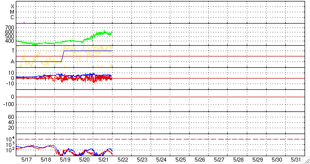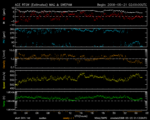 2008/ 5/22 10:14 更新 550〜600km/秒の高速太陽風が続いています。磁気圏もやや活動的です。 担当 篠原 昨日のニュースの後、太陽風の速度はもう少し上がって、550km/秒になりました。 その後は、550〜600km/秒で安定した状態が続いています。 太陽風の磁場は、速度が上がるとともに下がり始め、 現在は5nTを割りつつあります。 高速風としては中盤の領域に入っている様です。 太陽風磁場の南北成分は、南北両方に振れていますが、 振れ幅が次第に小さくなっている様です。 そのためでしょうか、AE指数を見ると、前半は700nTの中規模活動が多く見られますが、 後半は頻度が下がり、振幅も500nTを割る様になっています。 高速風は続いていますが、磁場強度が下がっているので、 今後の磁気圏活動は比較的小規模に留まりそうです。 今日もSTEREOの太陽コロナ写真を掲載します。 この衛星は2日ほど先を見ているため、 現在の高速風をもたらしているコロナホールは、既に西の端に消え去りつつあります。 この様子では、2日後には高速風も弱まっていそうです。 一方、次のコロナホールが、太陽の中心に来ています。 いつものSOHO衛星だと、これから3日後くらいに高速風が、となりますが、 今回はそれに2日ほど追加して、5日後に高速風が来る可能性があります。 前周期は、このコロナホールはもう少し淡く見えていました。 そのためか、前周期は高速風は来ませんでした。 今回はどうなるでしょうか。 5月27日頃に注目して下さい。 放射線帯の高エネルギー電子は、低いレベルに留まっています。 これから増加を始めるかもしれませんので、しばらく注意して下さい。 太陽は無黒点になったそうです。 SOHOの写真が止まっているので、掲載はしていません。 X線は低いレベルで、とても静かです。 STEREO衛星極紫外線望遠鏡EUVI195による太陽コロナ。22日9時(世界時22日0時)。2日ほど先回りしています。 (c) NASA ![]() ACEが観測した太陽風の磁場(1番上の枠、白線は全体の強度、赤線は南北成分) および、太陽風の密度(3番目の橙線)、速度(4番目の黄線) (c) NOAA/SWPC ![]() リアルタイムAE指数 下段のAEグラフの値が高くなると、オーロラ活動が活発化しています。 (c) 京都大学, NICT ![]() シベリアで観測された3日間の磁場データ 右側の3分の1が、昨日のデータになります。グラフが上がったり下がったりすると、オーロラ活動が活発化しています。 (c) NICT ![]() 27日の太陽周期に合わせたデータプロット 太陽が同じ面を地球に向けていた27日前の変化から、今後を予想することができます。 (c) NICT