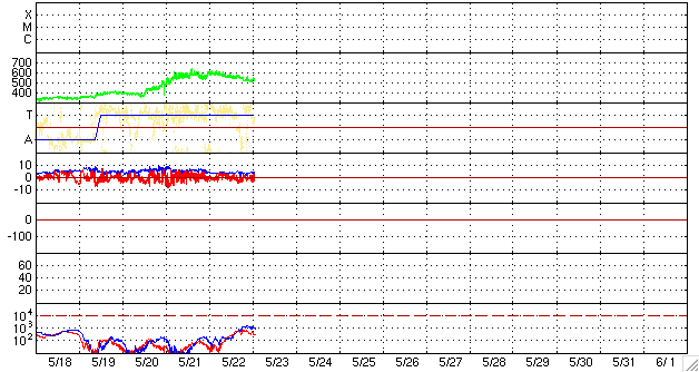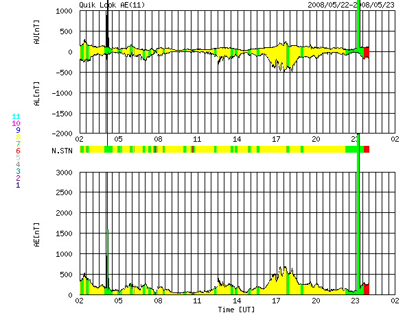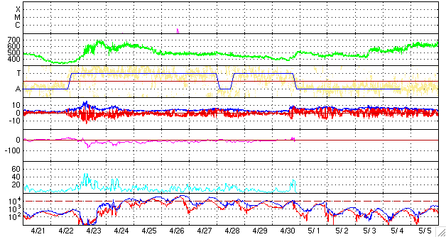 ACEが観測した太陽風の磁場(1番上の枠、白線は全体の強度、赤線は南北成分) および、太陽風の密度(3番目の橙線)、速度(4番目の黄線) (c) NOAA/SWPC ![]() リアルタイムAE指数 下段のAEグラフの値が高くなると、オーロラ活動が活発化しています。 (c) 京都大学, NICT ![]() シベリアで観測された3日間の磁場データ 右側の3分の1が、昨日のデータになります。グラフが上がったり下がったりすると、オーロラ活動が活発化しています。 (c) NICT ![]() 27日の太陽周期に合わせたデータプロット 太陽が同じ面を地球に向けていた27日前の変化から、今後を予想することができます。 (c) NICT