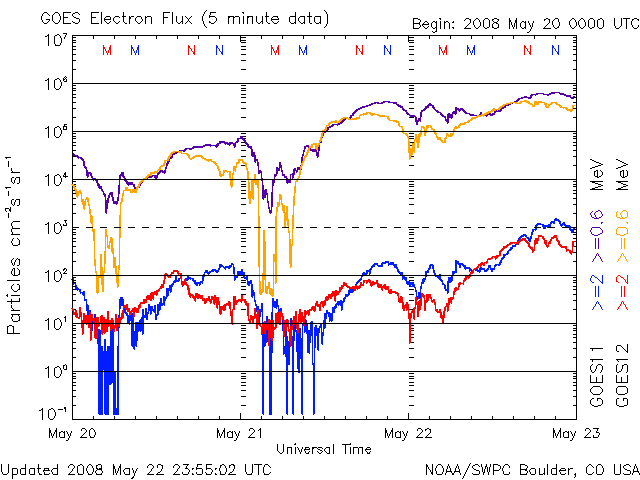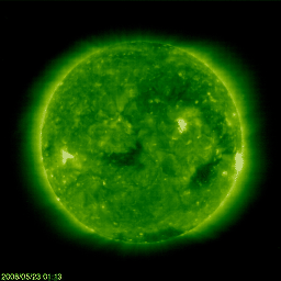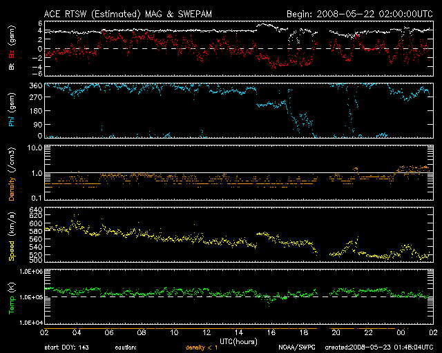 2008/ 5/23 10:49 更新 太陽風の速度は500km/秒に下がり、高速風は後半に入っています。太陽の中心に次のコロナホールが来ています。 担当 篠原 昨日のニュース以降、太陽風の速度はゆっくりと下がっています。 現在、ほぼ500km/秒になっています。 高速風は続いていますが、次第に影響は弱まります。 磁気圏の活動は、AE指数で500nT前後の変動が断続的に見られています。 太陽風磁場が、南北両方に(マイナスにもプラスにも)振れているためです。 SOHO EIT195の写真が更新されています。 一昨日、21日に掲載したSTEREOの写真とよく似ています。 こういう時に、時差を確認しておくとよいでしょう。 太陽の西側(右側)に去りつつあるコロナホールが、現在の高速風をもたらしています。 これらが通り過ぎることで、太陽風は一旦落ち着くのではないでしょうか。 そして、次のコロナホールが、ちょうど太陽の中心に来ています。 ここからの影響は、3日後の26日くらいにやって来ると思われます。 コロナホールは、濃く、はっきりと見えていますが、 規模がそれほど大きくないので、高速風の影響もそれほど大きくはなさそうです。 放射線帯の高エネルギー電子は、1000まで上昇しています。 高速風が終わりに近づいていますから、今回は大きく増加することはないでしょう。 太陽は無黒点です。 X線のグラフは変化が見られず、穏やかです。 SOHO衛星のEIT195カメラの映像 (c) SOHO (ESA & NASA)