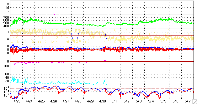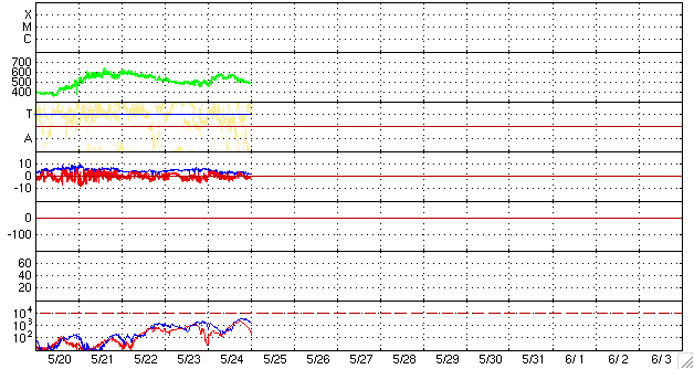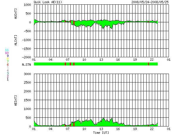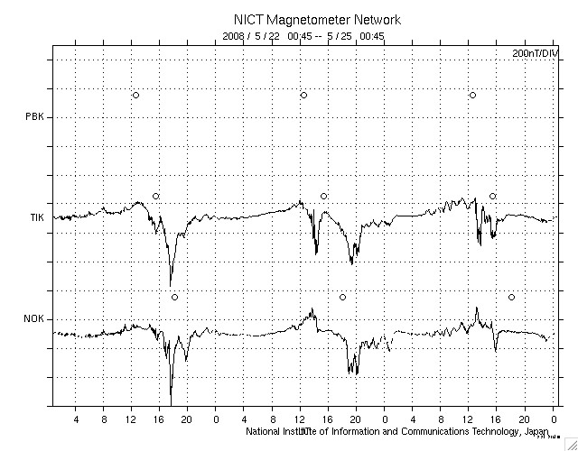 ACEが観測した太陽風の磁場(1番上の枠、白線は全体の強度、赤線は南北成分) および、太陽風の密度(3番目の橙線)、速度(4番目の黄線) (c) NOAA/SWPC ![]() リアルタイムAE指数 下段のAEグラフの値が高くなると、オーロラ活動が活発化しています。 (c) 京都大学, NICT ![]() シベリアで観測された3日間の磁場データ 右側の3分の1が、昨日のデータになります。グラフが上がったり下がったりすると、オーロラ活動が活発化しています。 (c) NICT ![]() 27日の太陽周期に合わせたデータプロット 太陽が同じ面を地球に向けていた27日前の変化から、今後を予想することができます。 (c) NICT
