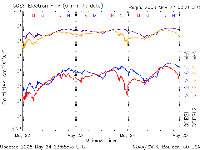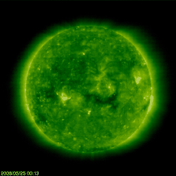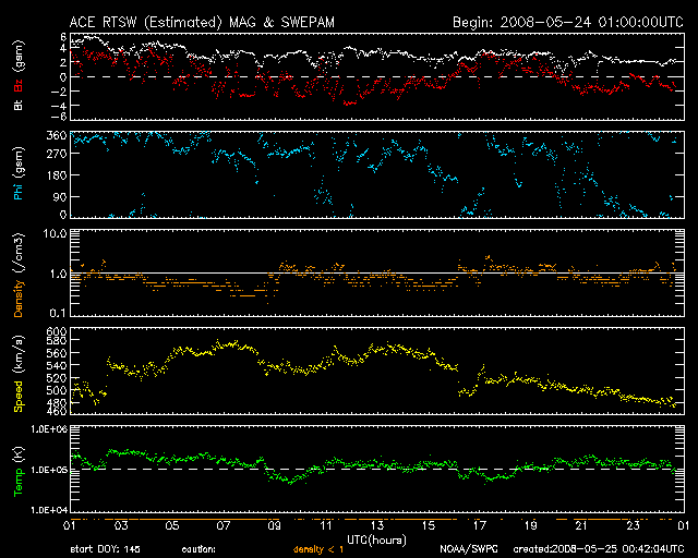 2008/ 5/25 09:43 更新 500km/秒前後の高速風が続いています。磁気圏は比較的穏やかです。 担当 篠原 昨日のニュースの後、太陽風は速度が560km/秒に少し上がり、半日ほどその速度を保ちました。 今日に入った頃から速度は下がり始め、現在は480km/秒になっています。 27日周期の図で、少し長い時間幅で太陽風速度の変化を見てください。 5月21日以降、4日間にわたって高速風の山が続いています。 最高速度は600km/秒に届いた程度で、それほど高くはなく、 あまり強い高速風ではありませんでした。 速度が少し上がった頃、太陽風磁場が南寄りになりました。 そのため、AE指数で300-500nTの小規模活動が数時間にわたって続いています。 その後、速度が下がるとともに、磁場強度は2nTに弱まりました。 このため、今後のオーロラ活動は一段弱いものになるでしょう。 今日いっぱい、太陽風は穏やかな状態が続くでしょう。 明日以降、再び、高速太陽風が始まる可能性があります。 コロナホールは、地球への影響が始まる目安の位置である、西側半分のところに近づいています。 これからどのような太陽風がやってくるでしょうか。 放射線帯高エネルギー電子は、少し上昇して、3000くらいに達しています。 ここから更に、大きく増加するということはないでしょう。 太陽は無黒点です。 フレア活動も全く静穏です。 SOHO衛星のEIT195カメラの映像 (c) SOHO (ESA & NASA)