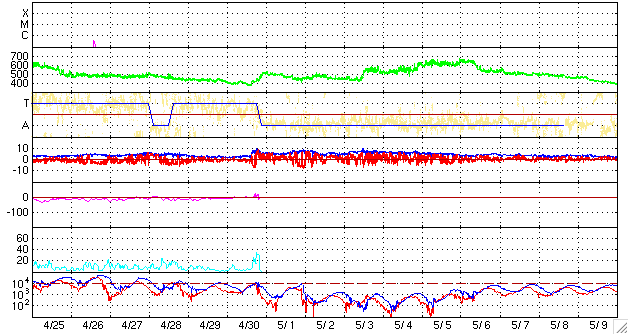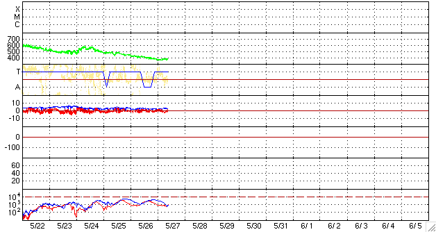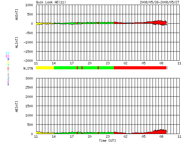 ACEが観測した太陽風の磁場(1番上の枠、白線は全体の強度、赤線は南北成分) および、太陽風の密度(3番目の橙線)、速度(4番目の黄線) (c) NOAA/SWPC ![]() リアルタイムAE指数 下段のAEグラフの値が高くなると、オーロラ活動が活発化しています。 (c) 京都大学, NICT ![]() シベリアで観測された3日間の磁場データ 右側の3分の1が、昨日のデータになります。グラフが上がったり下がったりすると、オーロラ活動が活発化しています。 (c) NICT ![]() 27日の太陽周期に合わせたデータプロット 太陽が同じ面を地球に向けていた27日前の変化から、今後を予想することができます。 (c) NICT