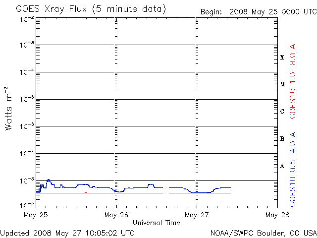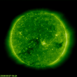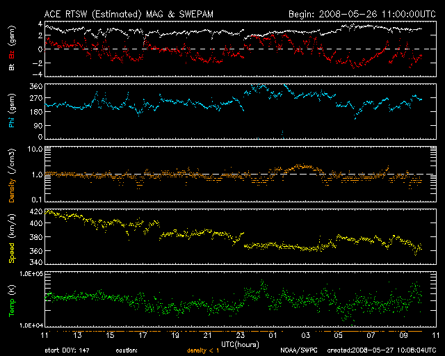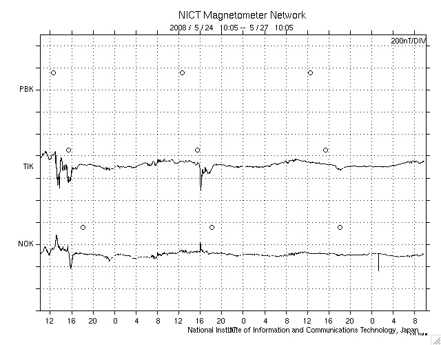 2008/ 5/27 19:06 更新 太陽風は低速になり、磁気圏はとても穏やかです。 担当 篠原 今日も更新が遅くなり、申し訳ありません。 太陽風の速度はますます下がって、370km/秒の低速風になっています。 磁場強度も3nTに弱まったままで、太陽風はとても穏やかです。 太陽風が穏やかなので、磁気圏も静穏です。 AE指数に変化は無く、シベリア磁場データも静かです。 来るかもと予想していた高速風は、来ないまま、 コロナホールは太陽の西側に去りつつあります。 27日周期の図では、4月30日に小さな乱れが見えていますが、 この27日後がちょうど今夜なので、 この後、太陽風に多少の変化があるかもしれません。 そして、SOHO EIT195では、次のコロナホールが太陽の中心に達しています。 こちらの影響は、3日後、5月30日か31日くらいになりそうです。 太陽では、ど真ん中に997黒点群が現れたそうです。 しかし、SOHOの写真では見つけることができませんでした。 X線に変化はなく、静穏です。 SOHO衛星のEIT195カメラの映像 (c) SOHO (ESA & NASA)