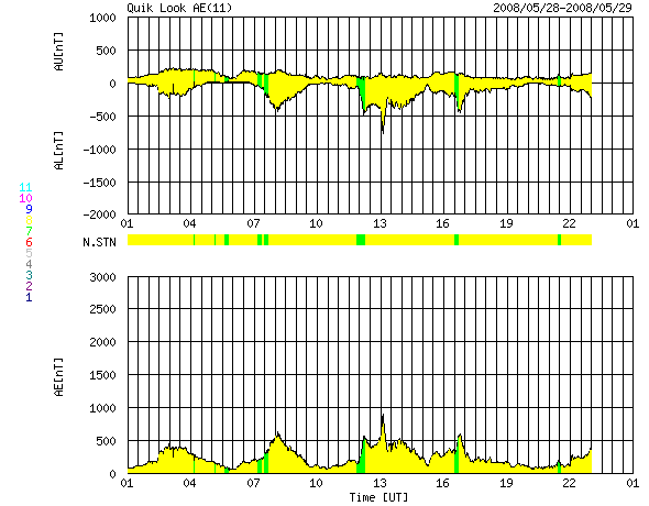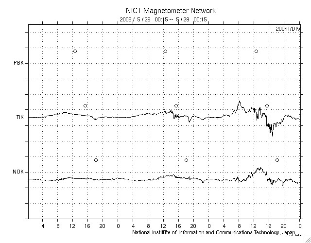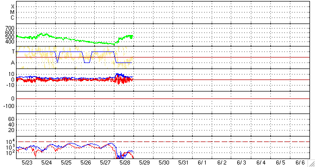 ACEが観測した太陽風の磁場(1番上の枠、白線は全体の強度、赤線は南北成分) および、太陽風の密度(3番目の橙線)、速度(4番目の黄線) (c) NOAA/SWPC ![]() リアルタイムAE指数 下段のAEグラフの値が高くなると、オーロラ活動が活発化しています。 (c) 京都大学, NICT ![]() シベリアで観測された3日間の磁場データ 右側の3分の1が、昨日のデータになります。グラフが上がったり下がったりすると、オーロラ活動が活発化しています。 (c) NICT ![]() 27日の太陽周期に合わせたデータプロット 太陽が同じ面を地球に向けていた27日前の変化から、今後を予想することができます。 (c) NICT