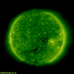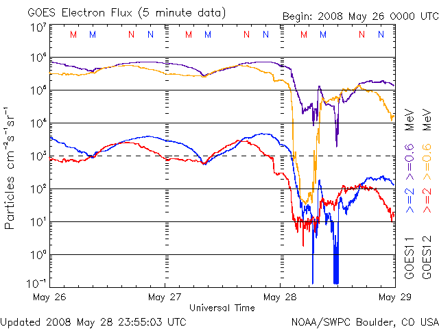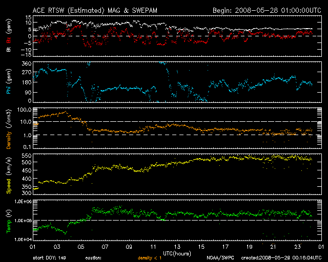 2008/ 5/29 09:17 更新 太陽風は570km/秒の高速風になっています。磁気圏活動も活動的になっています。 担当 篠原 昨日、28日10時半(世界時28日1時半)に始まった高速太陽風は、 速度が570km/秒に上がっています。 一方、磁場強度は10nTから5nTに弱まっていて、速度の上昇は一段落ついたようです。 磁気圏のオーロラ活動も活発化しています。 AE指数は、500nTを超える程度の中規模活動が数時間おきに頻繁に発生しています。 太陽風の速度が上がり、磁場の南北成分が南北に変化しているためです。 今後も、同程度の高速風、磁気圏活動が続きそうです。 明日遅くか、明後日には、次のコロナホールの影響がやって来ると予想されます。 SOHO EIT195の写真を見てください。 太陽の中心から南極へ向かって細長くコロナホールが伸びています。 ここから噴き出している高速風です。 27日周期の図で前回の様子を見ると、 5月3日から5月8日にかけて、太陽風速度の高まりが続いています。 これは、今周期では5月30日から6月4日に相当します。 (この図は世界時です。図の中の0時(日付の線)は、日本時間では9時です) この時の最高速度は650km/秒で、今回はどの程度まで上がるでしょうか。 放射線帯高エネルギー電子は、大きく数を減らしたままです。 これからしばらく高速風が続きそうですので、今後の変化に注意してください。 太陽は無黒点でとても穏やかです。 SOHO衛星のEIT195カメラの映像 (c) SOHO (ESA & NASA)