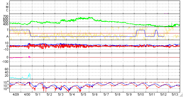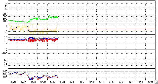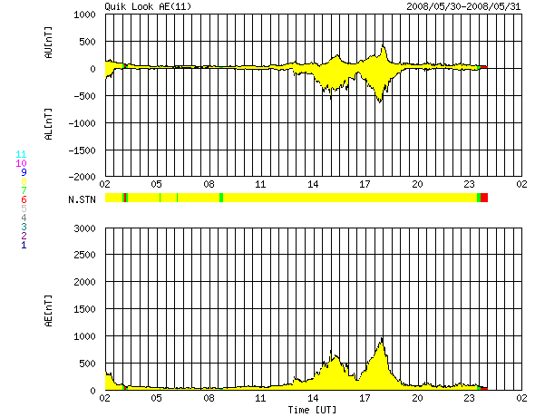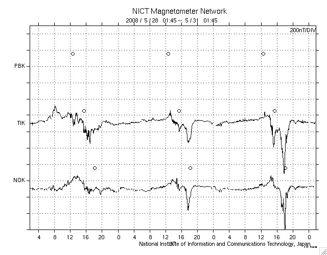 ACEが観測した太陽風の磁場(1番上の枠、白線は全体の強度、赤線は南北成分) および、太陽風の密度(3番目の橙線)、速度(4番目の黄線) (c) NOAA/SWPC ![]() リアルタイムAE指数 下段のAEグラフの値が高くなると、オーロラ活動が活発化しています。 (c) 京都大学, NICT ![]() シベリアで観測された3日間の磁場データ 右側の3分の1が、昨日のデータになります。グラフが上がったり下がったりすると、オーロラ活動が活発化しています。 (c) NICT ![]() 27日の太陽周期に合わせたデータプロット 太陽が同じ面を地球に向けていた27日前の変化から、今後を予想することができます。 (c) NICT