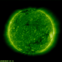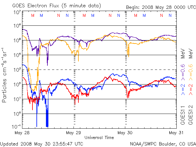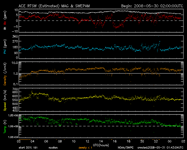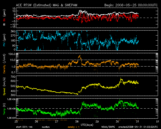 2008/ 5/31 10:42 更新 550〜600km/秒の高速太陽風が来ています。磁気圏活動も活発になっています。 担当 篠原 昨日、コロナホールの影響がやって来るかもしれないと書きましたが、 その直後から、太陽風の速度が再上昇し、550〜600km/秒へと一段強まっています。 今日の1枚目の図は、1週間幅のACEの図です。 まず、28日に高速風の始まりがやって来ました(黄色線)。 ここでは、磁場強度(白線)や、密度(橙色線)も大きく強まっています。 そして、30日に入ったところ(日本時間では30日の朝)で、 次の速度の上昇が起こっています。 これが、昨日のSOHOの写真に見えていた、コロナホールの影響だろうと思います。 27日周期の図で前周期と比べると、半日ほど到来が早まりました。 この程度の変化は普通に見られることです。 ACEの1日の図を見ると、まん中付近で-5nTに達する南向き磁場(赤線)が発生しています。 速度が高まっているので、地球への影響も大きそうです。 次に、AE指数を見てください。 太陽風の磁場が南を向いた時間帯に、 600nTと900nTの中規模のオーロラ活動が発生しています。 2回起こっているのは、磁場の南向きも大きく2回に分かれているためでしょう。 細かく見ると、オーロラの発生時間は南向き磁場よりも1〜2時間ほど遅れて見えます。 これは、ACEで観測された太陽風が、地球までやってくるのに1時間弱かかることや、 磁場が南を向いて磁気圏に流れ込んだエネルギーが、 オーロラ活動を次第に発達させていくので、少し遅れて見えることなどが原因です。 SOHO EIT195を見ると、コロナホールは緯度が上がりながら(赤道から離れながら)、 南極や北極へとつながっています。 その伸びて行く部分が、ちょうど太陽のまん中に来ています。 現在の高速風は、この領域が通過するまで、もう3〜4日程度続くのではないでしょうか。 放射線帯の高エネルギー電子は、今のところほとんど変化はありません。 低いレベルに留まっています。 高速風が続いていますので、引き続き注意してください。 太陽は静穏です。 黒点はなく、X線のグラフも変化はありません。 1週間の太陽風の変化。28日に速度が上がり、30日に再上昇している。 (c) NOAA/SWPC ![]() SOHO衛星のEIT195カメラの映像 (c) SOHO (ESA & NASA)