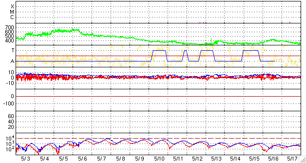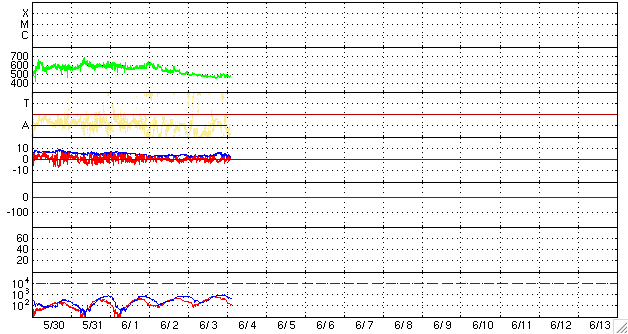 ACEが観測した太陽風の磁場(1番上の枠、白線は全体の強度、赤線は南北成分) および、太陽風の密度(3番目の橙線)、速度(4番目の黄線) (c) NOAA/SWPC ![]() リアルタイムAE指数 下段のAEグラフの値が高くなると、オーロラ活動が活発化しています。 (c) 京都大学, NICT ![]() シベリアで観測された3日間の磁場データ 右側の3分の1が、昨日のデータになります。グラフが上がったり下がったりすると、オーロラ活動が活発化しています。 (c) NICT ![]() 27日の太陽周期に合わせたデータプロット 太陽が同じ面を地球に向けていた27日前の変化から、今後を予想することができます。 (c) NICT