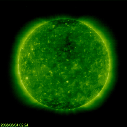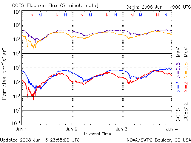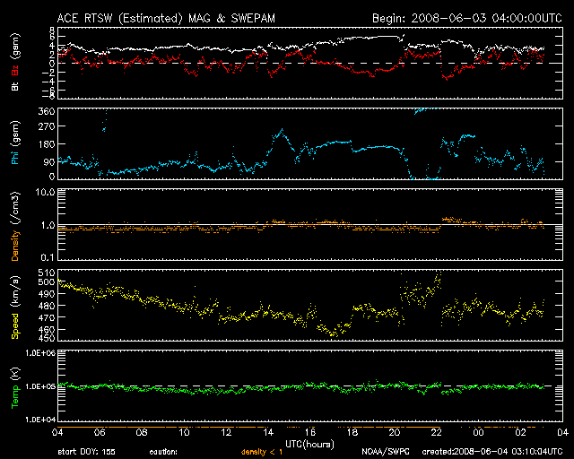2008/ 6/ 4 12:06 更新 太陽風の速度は、470km/秒へゆっくりと下がっています。磁気圏はとても静かです。 担当 篠原 太陽風の速度は、470km/秒まで下がったところで落ち着いています。 高速太陽風は終わりつつあると思われます。 前周期の変化から考えると、今日いっぱい高めの速度が残り、 明日くらいに、通常レベルの400km/秒へ下がると思われます。 磁気圏はとても静穏です。 AE指数、シベリア磁場データともにほとんど変化していません。 太陽風が穏やかになって来たので、このあとも静かな磁気圏が続くでしょう。 今後の変化ですが、前周期はこの後、低速の太陽風が2週間近く続きました。 今回も概ねその傾向にありそうですが、 SOHO EIT195の太陽コロナホール写真では、 太陽の北半球寄りにやや淡めのコロナホールが見えています。 小規模の乱れにとどまると思いますが、 ここからの影響が2-3日後にやって来るかもしれません。 太陽は無黒点で、とても静穏です。 STEREOの写真を見ても、しばらく黒点がやって来る気配はありません。 今朝、きぼう船内実験室の取り付けに成功したそうです。 素晴らしいですね! SOHO衛星のEIT195カメラの映像 (c) SOHO (ESA & NASA)