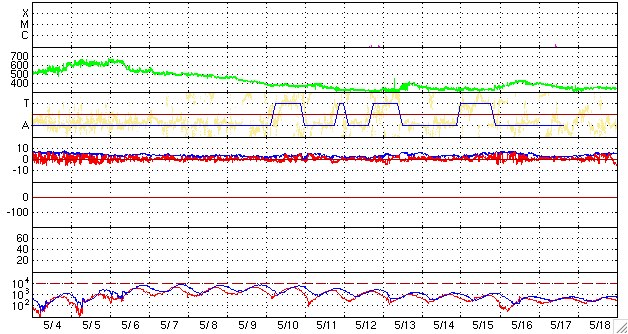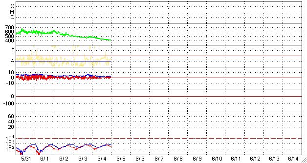 ACEが観測した太陽風の磁場(1番上の枠、白線は全体の強度、赤線は南北成分) および、太陽風の密度(3番目の橙線)、速度(4番目の黄線) (c) NOAA/SWPC ![]() リアルタイムAE指数 下段のAEグラフの値が高くなると、オーロラ活動が活発化しています。 (c) 京都大学, NICT ![]() シベリアで観測された3日間の磁場データ 右側の3分の1が、昨日のデータになります。グラフが上がったり下がったりすると、オーロラ活動が活発化しています。 (c) NICT ![]() 27日の太陽周期に合わせたデータプロット 太陽が同じ面を地球に向けていた27日前の変化から、今後を予想することができます。 (c) NICT