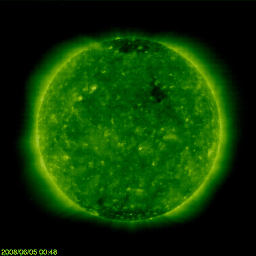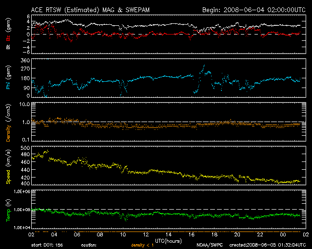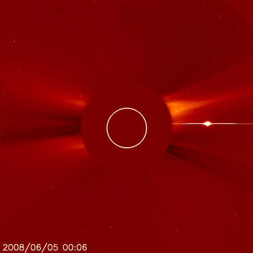 2008/ 6/ 5 10:33 更新 太陽風は、400km/秒と通常の速度に下がりました。磁気圏もとても穏やかです。 担当 篠原 金星が、ゆっくりと太陽の向こう側を回ろうとしています(外合)。 これまで、SOHOのLASCO C3カメラで移動の様子が見えていましたが、 金星が太陽に近づいて、現在はLASCO C2カメラの視野に入っています。 今回の接近では、このまま太陽と重なってしまうようです(それを見ることはできませんが)。 今日の宇宙天気は、とても穏やかです。 太陽風は、速度が400km/秒に下がり、平均的な風速に戻りました。 磁場強度は3nTに弱まったままで、太陽風は穏やかです。 このため、磁気圏もとても静穏で、 AE指数、シベリア磁場データともに、ほとんど変化がありません。 SOHO EIT195の太陽コロナを見ると、 北半球中緯度にぽかっとあいたコロナホールが、次第に西へ移動しています。 明日くらいに、地球へ影響が及び始める目安の位置に達しそうです。 規模が比較的小さいので、影響が見られるのかどうか、太陽風の変化に注目して下さい。 コロナホールは、太陽の北極と南極にも大きく広がっています。 太陽活動極小期の特徴的な姿です。 太陽には、黒点はなく、とても穏やかです。 金星が太陽に近づいています。SOHO LASCO C2カメラで見える様になりました。 (c) SOHO (ESA & NASA) ![]() SOHO衛星のEIT195カメラの映像 (c) SOHO (ESA & NASA)