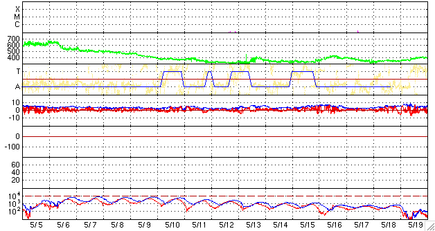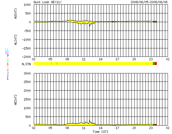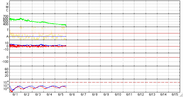 GOES衛星の太陽X線データ (c) NOAA/SWPC ![]() ACEが観測した太陽風の磁場(1番上の枠、白線は全体の強度、赤線は南北成分) および、太陽風の密度(3番目の橙線)、速度(4番目の黄線) (c) NOAA/SWPC ![]() リアルタイムAE指数 下段のAEグラフの値が高くなると、オーロラ活動が活発化しています。 (c) 京都大学, NICT ![]() シベリアで観測された3日間の磁場データ 右側の3分の1が、昨日のデータになります。グラフが上がったり下がったりすると、オーロラ活動が活発化しています。 (c) NICT ![]() 27日の太陽周期に合わせたデータプロット 太陽が同じ面を地球に向けていた27日前の変化から、今後を予想することができます。 (c) NICT