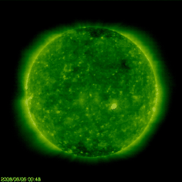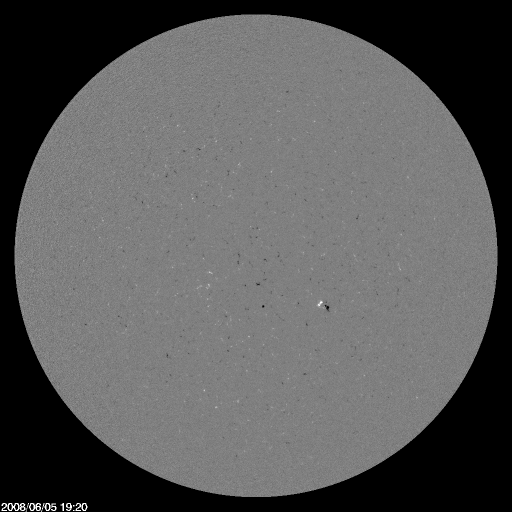 2008/ 6/ 6 10:14 更新 太陽風の速度はやや低速になっています(370km/秒)。小さな黒点群が出現しています。 担当 篠原 太陽に小さな黒点群が出現しました。 太陽の中心からやや南西(右下)に下がったあたりです。 掲載の写真では、2つに分かれた黒点が見えています。 赤道に近く、前の周期、23活動周期の性質を持った黒点群です。 2枚めの写真で磁場の分布を見てください。 [ 白(N) 黒(S) ]と並んでいて、これは23期の南半球の黒点群の極性です。 フレア活動は見られず、太陽は静穏です。 太陽風の速度は、400km/秒から370km/秒に下がり、低速風に変わりつつあります。 磁場強度も3nTに弱まったままで、 今のところ、SOHO ET195に見えていたコロナホールの影響は来ていません。 EIT 195では、コロナホールは影響開始の目安の位置に達したところなので、 これから明日にかけて、注目といったところでしょう。 磁気圏はとても静かです。 AE指数は目立った変化はありません。 これから太陽風に変化があるかどうかですが、来たとしても小規模でしょう。 基本的には、6月15日くらいまでは穏やかな状態が続くと思います。 太陽に小さな黒点が出現しています。中心やや右下です。赤道に近く、23期(前の周期)に属する黒点です。 (c) SOHO (ESA & NASA) ![]() 黒点群の磁場分布を見て下さい。[ 白 黒 ]と並んでいます。これは、23期の南半球側の極性です。 (c) SOHO (ESA & NASA) ![]() SOHO衛星のEIT195カメラの映像 (c) SOHO (ESA & NASA)
