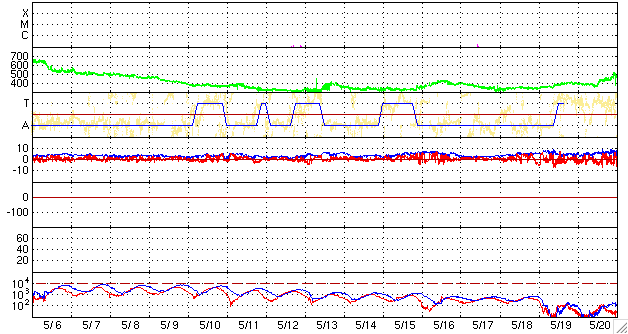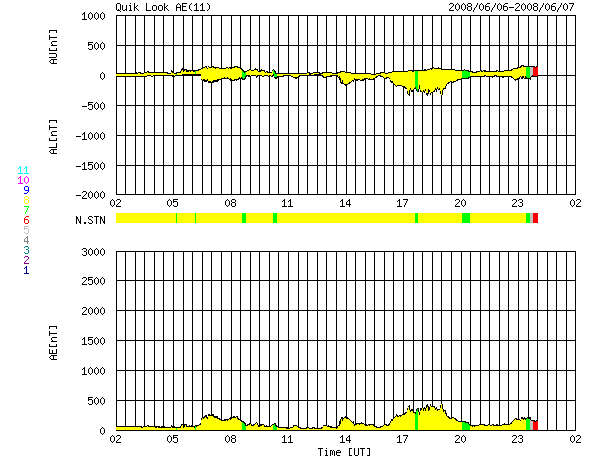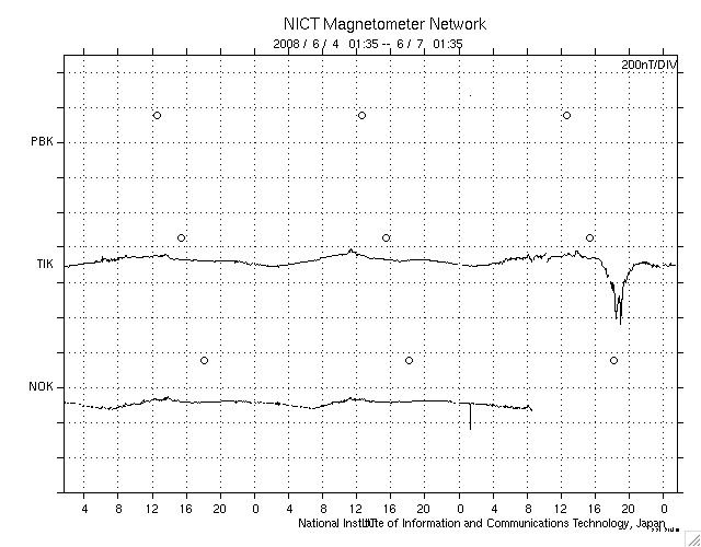 ACEが観測した太陽風の磁場(1番上の枠、白線は全体の強度、赤線は南北成分) および、太陽風の密度(3番目の橙線)、速度(4番目の黄線) (c) NOAA/SWPC ![]() リアルタイムAE指数 下段のAEグラフの値が高くなると、オーロラ活動が活発化しています。 (c) 京都大学, NICT ![]() シベリアで観測された3日間の磁場データ 右側の3分の1が、昨日のデータになります。グラフが上がったり下がったりすると、オーロラ活動が活発化しています。 (c) NICT ![]() 27日の太陽周期に合わせたデータプロット 太陽が同じ面を地球に向けていた27日前の変化から、今後を予想することができます。 (c) NICT