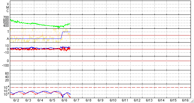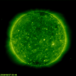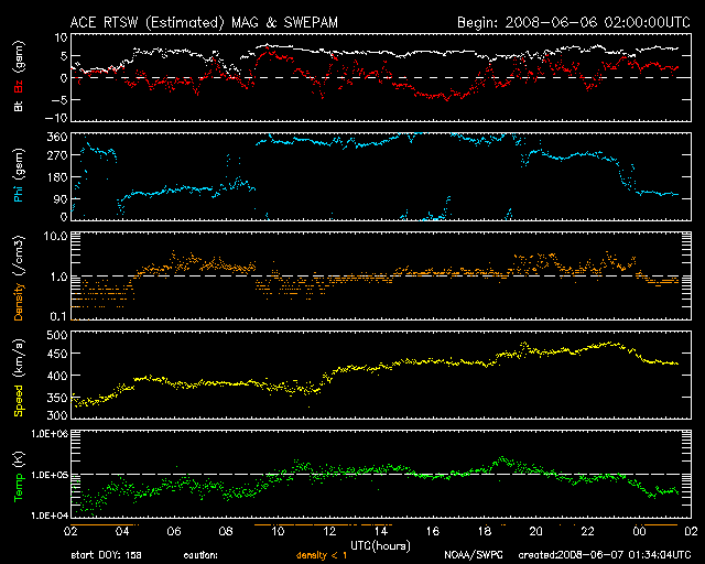 2008/ 6/ 7 10:37 更新 一時的に太陽風の速度が470km/秒に上がりました。コロナホールの影響が来た様です。 担当 篠原 昨日のニュースの後くらいから、太陽風の速度がゆっくりと上がり、 1日ほどかかって、今朝、7日8時(世界時7日23時)に470km/秒に達しました。 速度が上昇を始めた頃から、磁場強度も6nTくらいにやや強まっています。 SOHO EIT195で見えていたコロナホールの影響がやってきたのでしょう。 現在、速度の上昇は一段落ついて、430km/秒くらいまで下がっていますが、 磁場強度は強まったままです。 ですので、速度は再び上昇する可能性もあると思います。 太陽風の乱れにともなって、磁気圏もやや活動的になっています。 AE指数では、400nTくらいの小規模の変動が発生しています。 シベリア磁場データでも、小規模の変化がひとつ見えています。 オーロラ活動が発生していた様です。 コロナホールの規模から考えて、太陽風の乱れはこの程度の小規模に留まりそうです。 磁場がまだ弱まっていないので、もうしばらく速度の乱れが続くかもしれません。 それでも、明日くらいで弱まって行くのではないでしょうか。 その後は、15日くらいまで静穏な状態が続きます。 SOHO EIT195でも、太陽の東側(左側)にコロナホールの影は見られません。 太陽は無黒点で、とても静穏です。 昨日お知らせした小さな黒点群は、既に消えています。 SOHO衛星のEIT195カメラの映像 (c) SOHO (ESA & NASA)