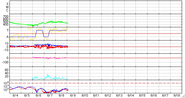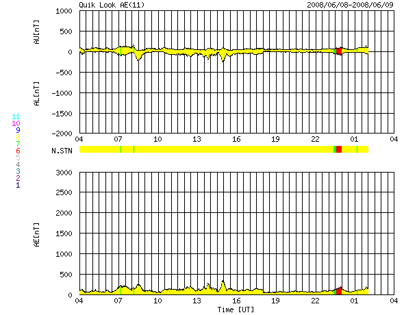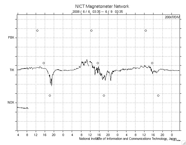 ACEが観測した太陽風の磁場(1番上の枠、白線は全体の強度、赤線は南北成分) および、太陽風の密度(3番目の橙線)、速度(4番目の黄線) (c) NOAA/SWPC ![]() リアルタイムAE指数 下段のAEグラフの値が高くなると、オーロラ活動が活発化しています。 (c) 京都大学, NICT ![]() シベリアで観測された3日間の磁場データ 右側の3分の1が、昨日のデータになります。グラフが上がったり下がったりすると、オーロラ活動が活発化しています。 (c) NICT ![]() 27日の太陽周期に合わせたデータプロット 太陽が同じ面を地球に向けていた27日前の変化から、今後を予想することができます。 (c) NICT