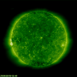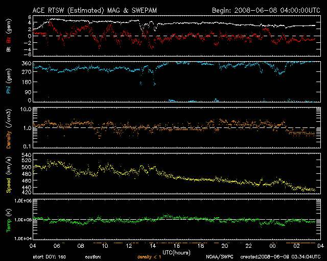 2008/ 6/ 9 12:35 更新 太陽風の速度はゆっくりと下がり、通常の状態に落ち着いています。磁気圏も静穏です。 担当 篠原 太陽風の速度は、ゆっくりと低下に向かっています。 昨日の500km/秒から、現在は、通常レベルの430km/秒まで下がっています。 速度はこの後もゆっくりと下がり、低速の太陽風に向かうと思われます。 太陽風の磁場強度も、3nTに弱まっています。 南北成分は、-1nTくらいの弱い南向きがたびたび見られています。 このためでしょう、AE指数も、100-200nTくらいの小さな変化がいくつも見られています。 それでも、基本的には磁気圏も静穏です。 SOHO EIT195では、太陽のコロナは全体的にぼんやりとしていて、 コロナホールなどの目立った構造は見られません。 太陽の東端(左端)から、明るい領域が上がって来ています。 STEREOで先回りをすると、この回りにコロナホールが広がっています。 これは、前周期にも見られたコロナホールで、 これがやがて太陽の中心に達し、次の太陽風の乱れをもたらすと予想されます。 それは、6月16日以降になりそうです。 もう2-3日すると、コロナホールもはっきりと見えて来るでしょう。 太陽はフレア活動はなく、とても静かです。 東側から上がって来る活動領域に黒点があるかどうか、明日以降の写真で見えて来るでしょう。 SOHO衛星のEIT195カメラの映像 (c) SOHO (ESA & NASA)