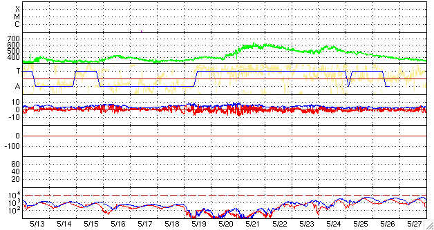 ACEが観測した太陽風の磁場(1番上の枠、白線は全体の強度、赤線は南北成分) および、太陽風の密度(3番目の橙線)、速度(4番目の黄線) (c) NOAA/SWPC ![]() リアルタイムAE指数 下段のAEグラフの値が高くなると、オーロラ活動が活発化しています。 (c) 京都大学, NICT ![]() シベリアで観測された3日間の磁場データ 右側の3分の1が、昨日のデータになります。グラフが上がったり下がったりすると、オーロラ活動が活発化しています。 (c) NICT ![]() 27日の太陽周期に合わせたデータプロット 太陽が同じ面を地球に向けていた27日前の変化から、今後を予想することができます。 (c) NICT