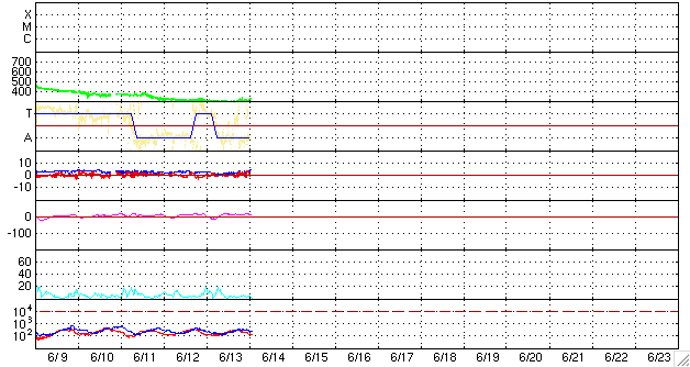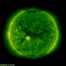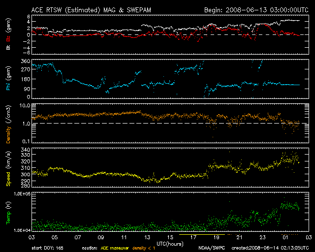 2008/ 6/14 11:14 更新 太陽風速度は低速で、磁気圏も穏やかです。これから高速風がやって来るでしょう。 担当 篠原 太陽風は、300-320km/秒と低速の状態が続いています。 磁場強度も2nTと弱まっていますが、最新のところで、4nTへ少し強まっています。 SOHO EIT195では、コロナホールが太陽の中心を大きく東西に横切っています。 その先頭(右端)は、地球への影響が及び始める目安の位置に達しています。 そろそろ、太陽風に変化が始まってもよいタイミングです。 磁場強度の上昇は、太陽風の乱れの始まりを告げているのかもしれません。 まだ変化幅が小さいことや、密度(橙色線)に変化がないことなど、 はっきりとはしていませんが、この後のACEのデータに注目してください。 更に磁場強度が上がり、密度が増えてくる様だと、高速風の始まりです。 現在の磁気圏は、とても静穏です。 AE指数は全く変化がありません。 シベリアの磁場データも、3日間ほとんど一本の線になっています。 太陽では、998黒点群は消えてしまった様です。 STEREOで少し先回りをすると、 2-3日後くらいに次の活動的な領域が上がって来そうです。 SOHO衛星のEIT195カメラの映像 (c) SOHO (ESA & NASA)